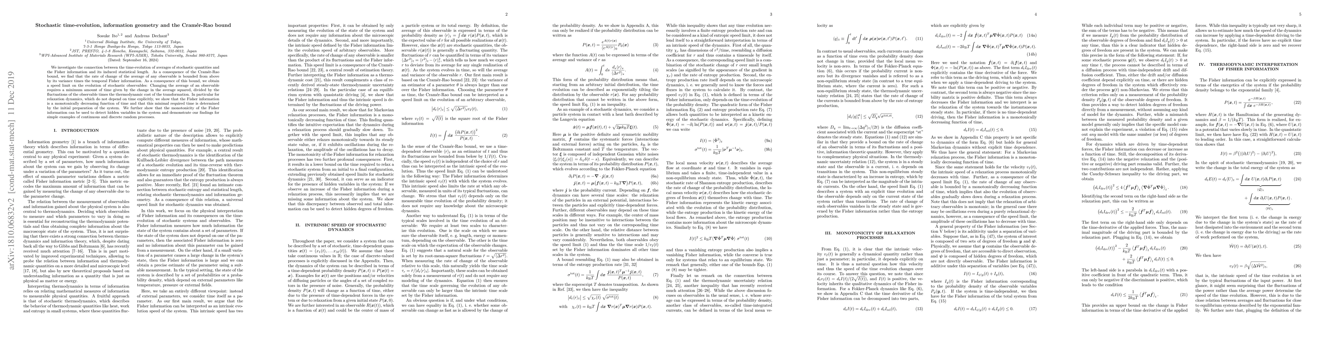 This paper explores the relationship between stochastic time-evolution, Fisher information, and the Cramer-Rao bound, establishing a speed limit for the evolution of stochastic observables based on their variance and thermodynamic costs. It reveals that the Fisher information decreases monotonically over time in relaxation dynamics, providing a method to detect hidden variables.