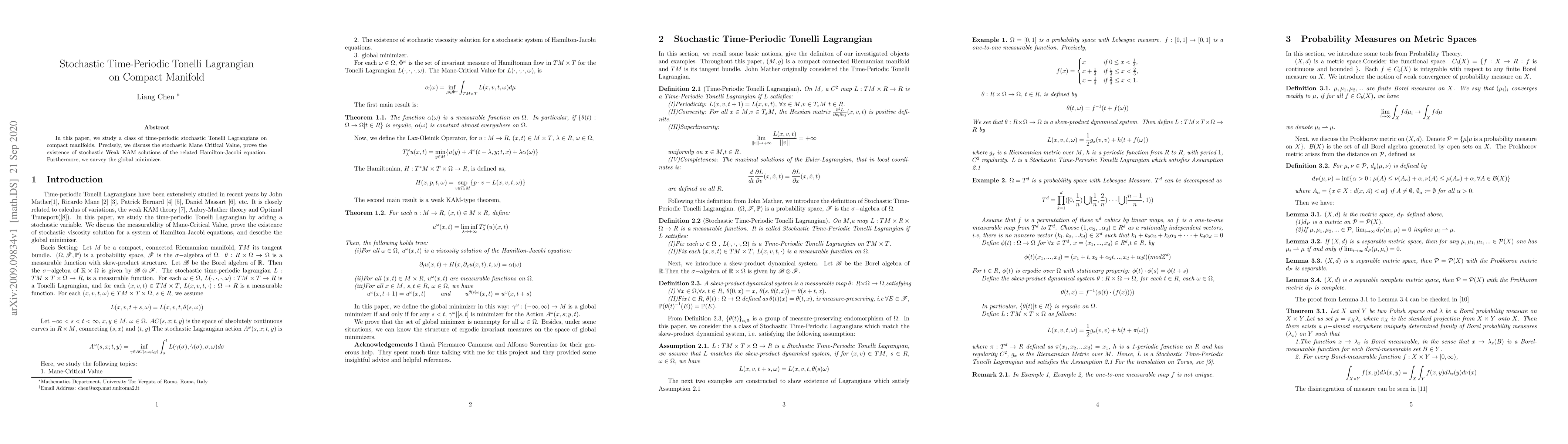 This paper investigates time-periodic stochastic Tonelli Lagrangians on compact manifolds, proving the existence of stochastic Weak KAM solutions for the associated Hamilton-Jacobi equation and discussing the stochastic Mane Critical Value and global minimizer.