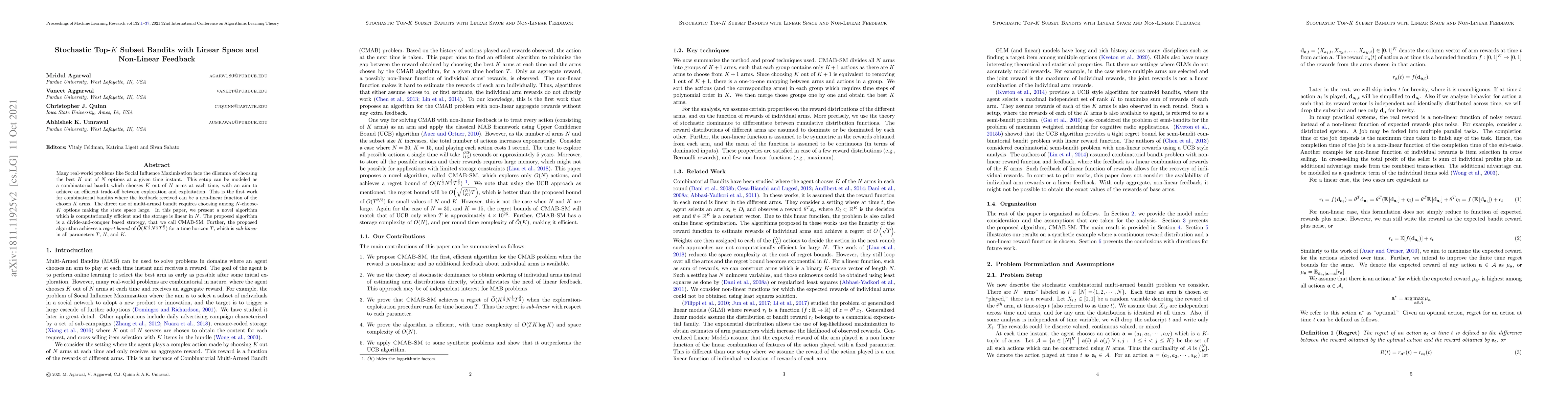 Many real-world problems like Social Influence Maximization face the dilemma of choosing the best $K$ out of $N$ options at a given time instant. This setup can be modeled as a combinatorial bandit which chooses $K$ out of $N$ arms at each time, with an aim to achieve an efficient trade-off between exploration and exploitation. This is the first work for combinatorial bandits where the feedback received can be a non-linear function of the chosen $K$ arms. The direct use of multi-armed bandit requires choosing among $N$-choose-$K$ options making the state space large. In this paper, we present a novel algorithm which is computationally efficient and the storage is linear in $N$. The proposed algorithm is a divide-and-conquer based strategy, that we call CMAB-SM. Further, the proposed algorithm achieves a \textit{regret bound} of $\tilde O(K^{\frac{1}{2}}N^{\frac{1}{3}}T^{\frac{2}{3}})$ for a time horizon $T$, which is \textit{sub-linear} in all parameters $T$, $N$, and $K$. %When applied to the problem of Social Influence Maximization, the performance of the proposed algorithm surpasses the UCB algorithm and some more sophisticated domain-specific methods.