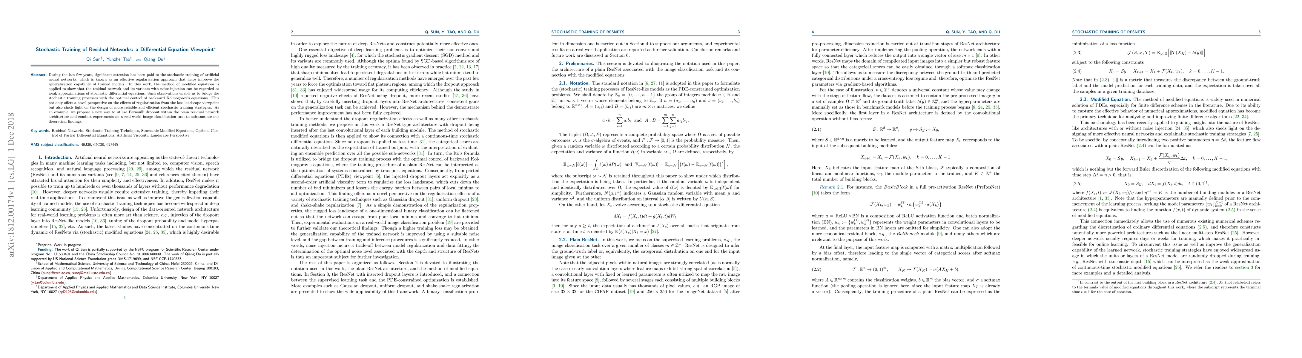 This paper demonstrates that stochastic training of residual networks can be viewed as weak approximations of stochastic differential equations, linking regularization effects to optimal control of backward Kolmogorov's equations. It proposes a novel Bernoulli dropout method within residual networks and validates it through experiments on image classification.
