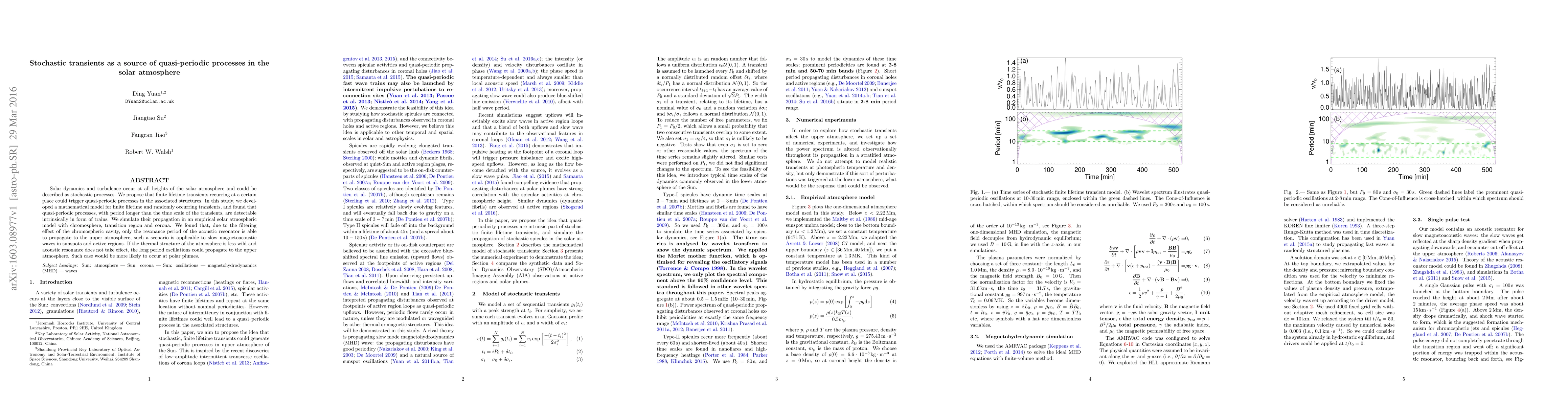 This paper proposes that stochastic transients in the solar atmosphere can generate quasi-periodic processes through finite lifetime events. The study develops a mathematical model to simulate these transients and finds that resonance periods can propagate to the upper atmosphere, particularly affecting sunspots and active regions.