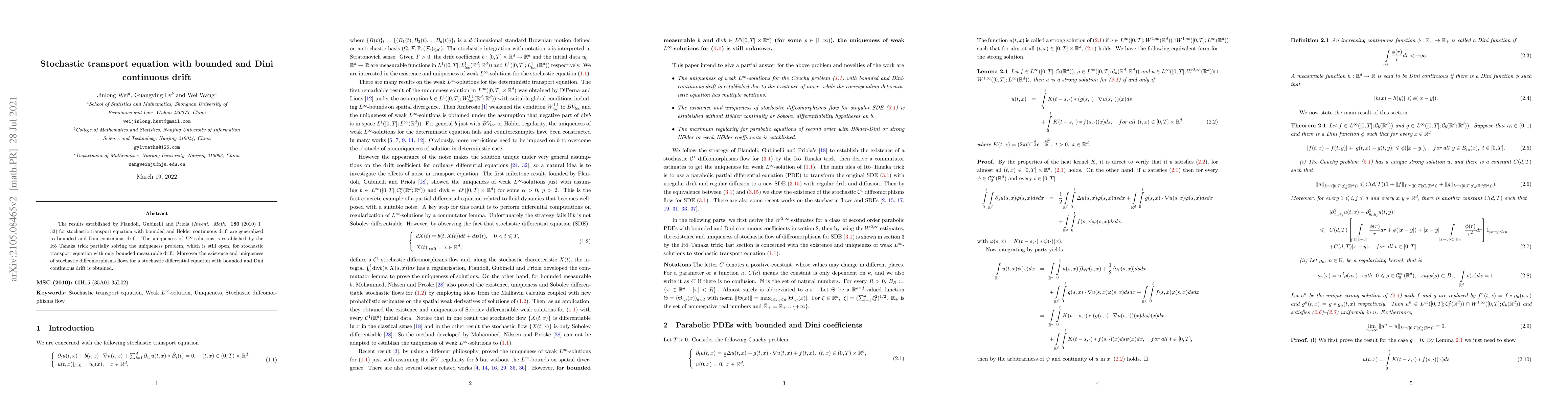 This paper generalizes results for stochastic transport equations with bounded and Dini continuous drift, establishing $L^\infty$-solution uniqueness via the Itô-Tanaka trick. It also proves the existence and uniqueness of stochastic diffeomorphisms for related stochastic differential equations.