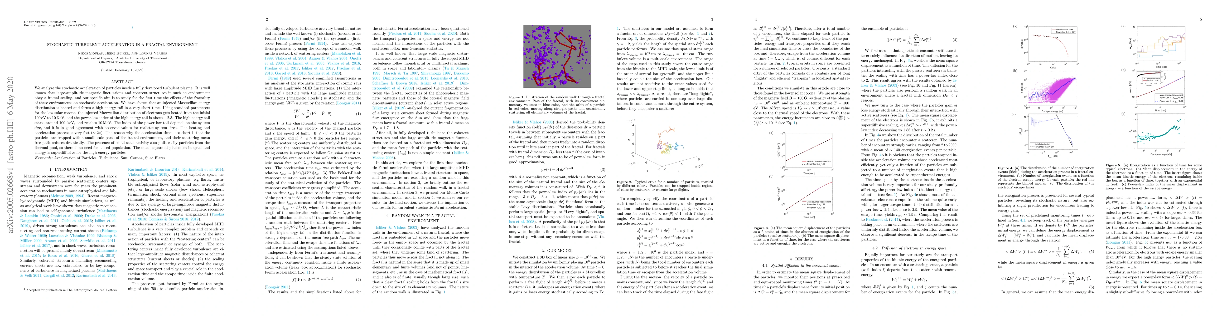 We analyze the stochastic acceleration of particles inside a fully developed turbulent plasma. It is well known that large-amplitude magnetic fluctuations and coherent structures in such an environment obey a fractal scaling, and our specific aim is to study for the first time the effects of the fractality of these environments on stochastic acceleration. We have shown that an injected Maxwellian energy distribution is heated and forms a high energy tail in a very short time. Using standard parameters for the low solar corona, the injected Maxwellian distribution of electrons gets heated from the initial 100 eV to 10 KeV, and the power-law index of the high energy tail is about -2.3-4.0. The high energy tail starts around 100 keV, and reaches 10 MeV. The index of the power-law tail depends on the system size, and it is in good agreement with observed values for realistic system sizes. The heating and acceleration process is very fast (\sim 2 s). The reason why the acceleration time is so short is that the particles are trapped within small scale parts of the fractal environment, and their scattering mean free path reduces drastically. The presence of small scale activity also pulls easily particles from the thermal pool, so there is no need for a seed population. The mean square displacement in space and energy is superdiffusive for the high energy particles.