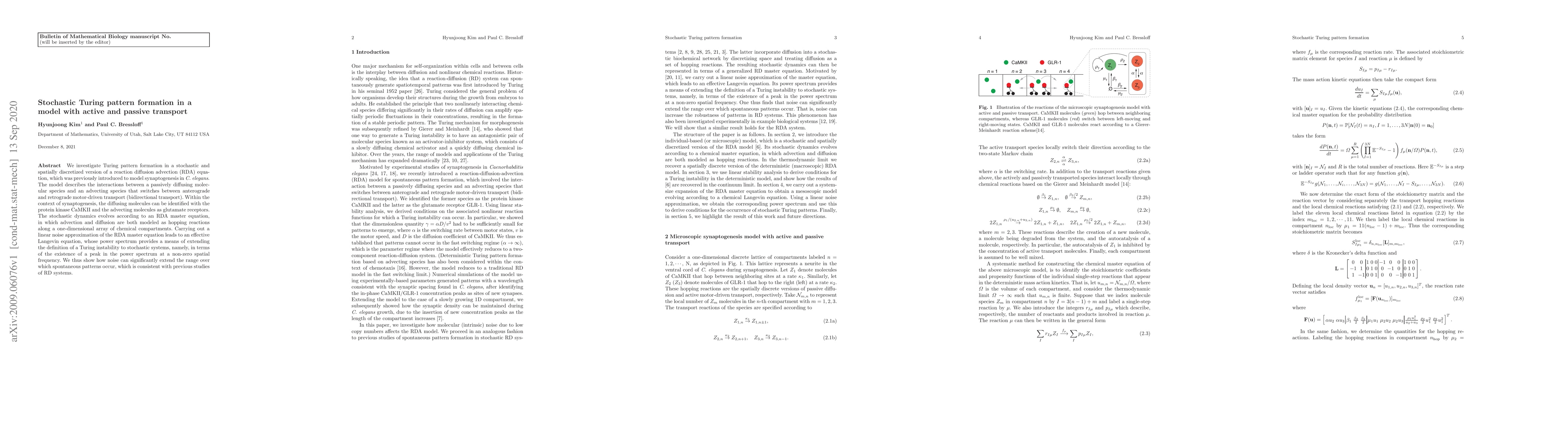 We investigate Turing pattern formation in a stochastic and spatially discretized version of a reaction diffusion advection (RDA) equation, which was previously introduced to model synaptogenesis in \textit{C. elegans}. The model describes the interactions between a passively diffusing molecular species and an advecting species that switches between anterograde and retrograde motor-driven transport (bidirectional transport). Within the context of synaptogenesis, the diffusing molecules can be identified with the protein kinase CaMKII and the advecting molecules as glutamate receptors. The stochastic dynamics evolves according to an RDA master equation, in which advection and diffusion are both modeled as hopping reactions along a one-dimensional array of chemical compartments. Carrying out a linear noise approximation of the RDA master equation leads to an effective Langevin equation, whose power spectrum provides a means of extending the definition of a Turing instability to stochastic systems, namely, in terms of the existence of a peak in the power spectrum at a non-zero spatial frequency. We thus show how noise can significantly extend the range over which spontaneous patterns occur, which is consistent with previous studies of RD systems.