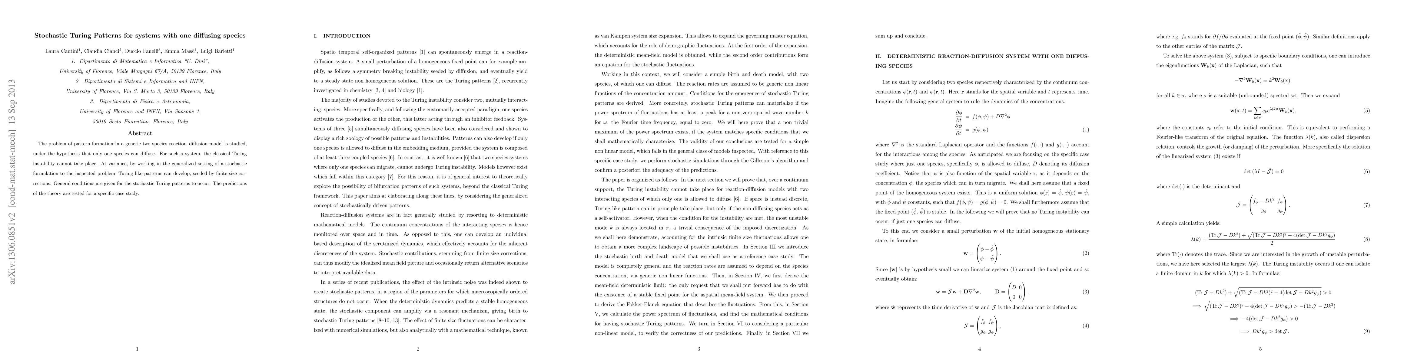 This paper explores pattern formation in a reaction-diffusion model where only one species can diffuse, showing that stochastic Turing-like patterns can emerge due to finite size corrections. General conditions for these stochastic patterns are identified, and the theory is validated through a specific case study.