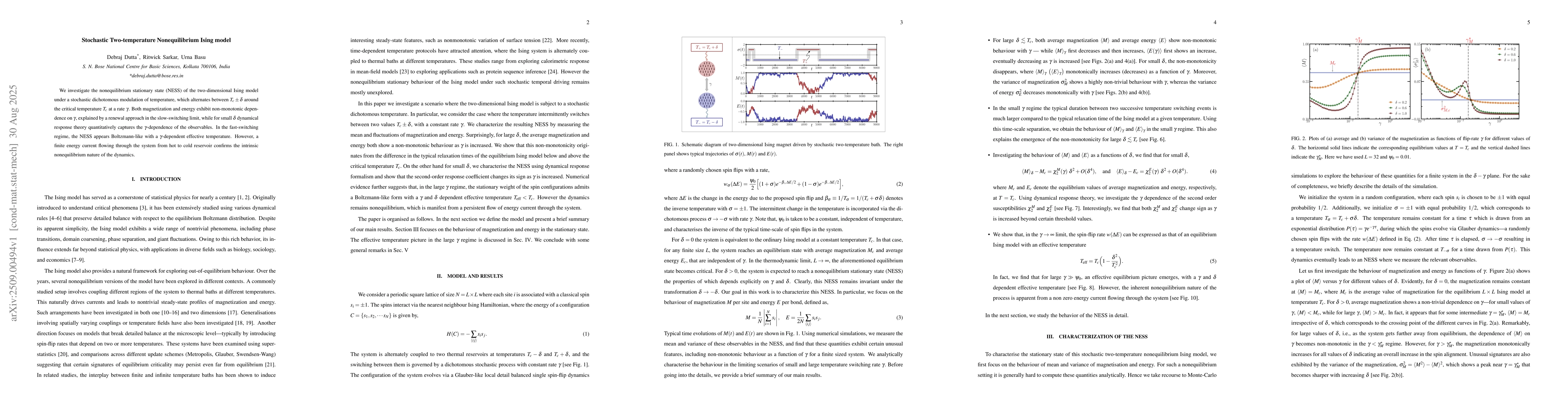 We investigate the nonequilibrium stationary state (NESS) of the two-dimensional Ising model under a stochastic dichotomous modulation of temperature, which alternates between $T_c \pm \delta$ around the critical temperature $T_c$ at a rate $\gamma$. Both magnetization and energy exhibit non-monotonic dependence on $\gamma$, explained by a renewal approach in the slow-switching limit, while for small $\delta$ dynamical response theory quantitatively captures the $\gamma$-dependence of the observables. In the fast-switching regime, the NESS appears Boltzmann-like with a $\gamma$-dependent effective temperature. However, a finite energy current flowing through the system from hot to cold reservoir confirms the intrinsic nonequilibrium nature of the dynamics.