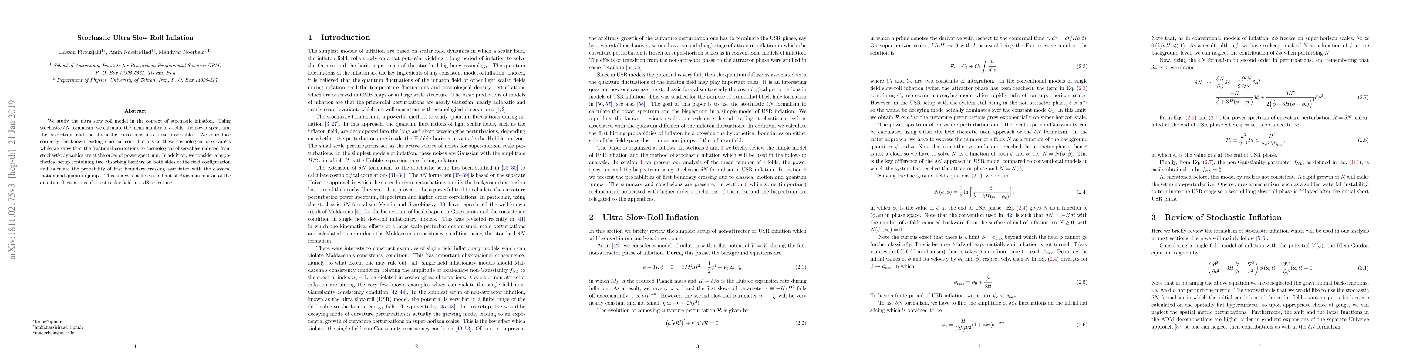 Researchers studied ultra slow roll inflation in stochastic context, reproducing known classical contributions while finding fractional corrections to cosmological observables on par with power spectrum, and calculating probability of first boundary crossing for a hypothetical setup.
