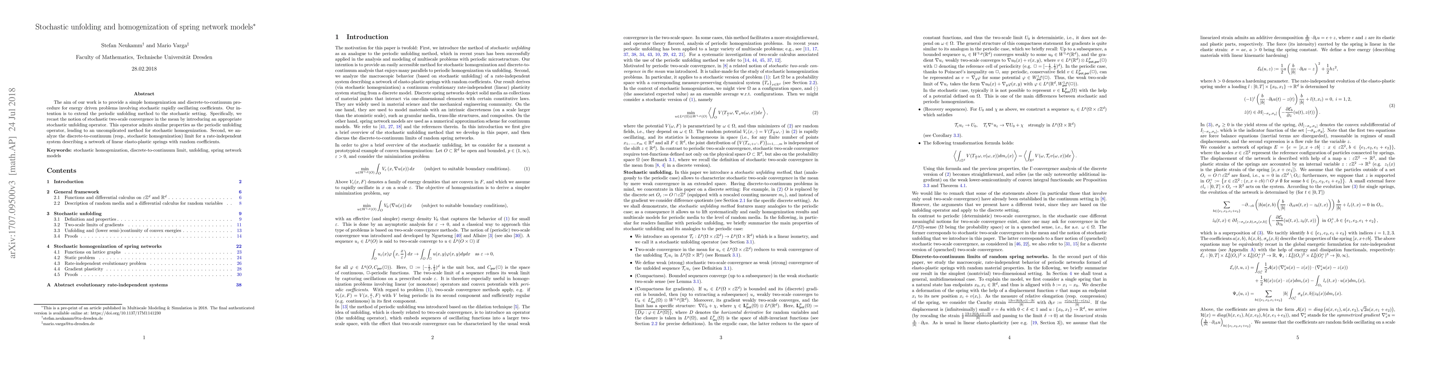 The aim of our work is to provide a simple homogenization and discrete-to-continuum procedure for energy driven problems involving stochastic rapidly-oscillating coefficients. Our intention is to extend the periodic unfolding method to the stochastic setting. Specifically, we recast the notion of stochastic two-scale convergence in the mean by introducing an appropriate stochastic unfolding operator. This operator admits similar properties as the periodic unfolding operator, leading to an uncomplicated method for stochastic homogenization. Secondly, we analyze the discrete-to-continuum (resp. stochastic homogenization) limit for a rate-independent system describing a network of linear elasto-plastic springs with random coefficients.