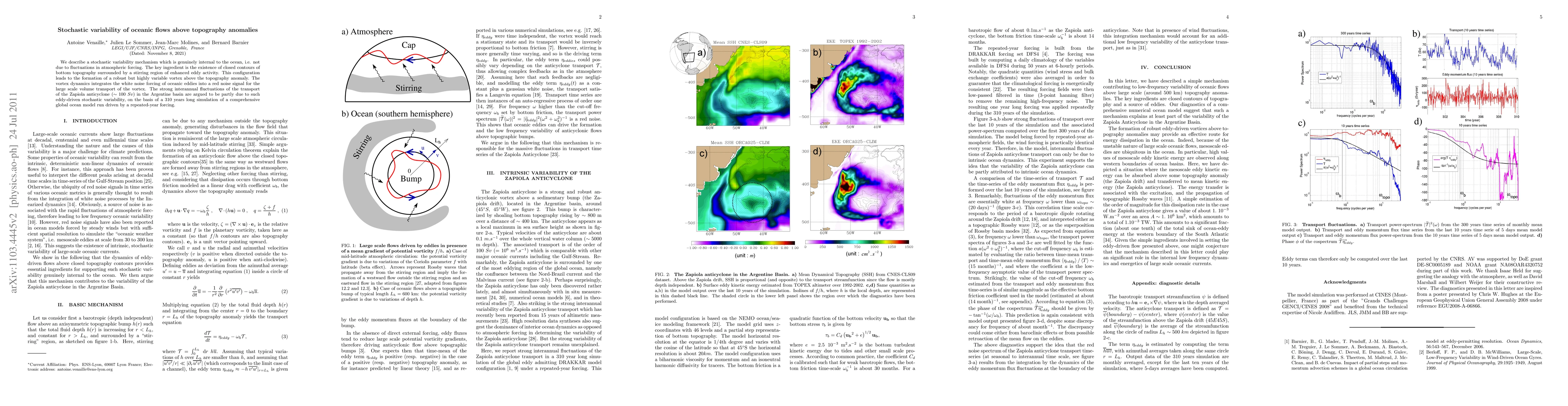 This paper explores a stochastic variability mechanism within the ocean, independent of atmospheric influences, driven by closed topography contours and enhanced eddy activity, leading to a variable vortex above topography anomalies. The study uses a long-term ocean model simulation to demonstrate the significant interannual fluctuations in the Zapiola anticyclone's transport.