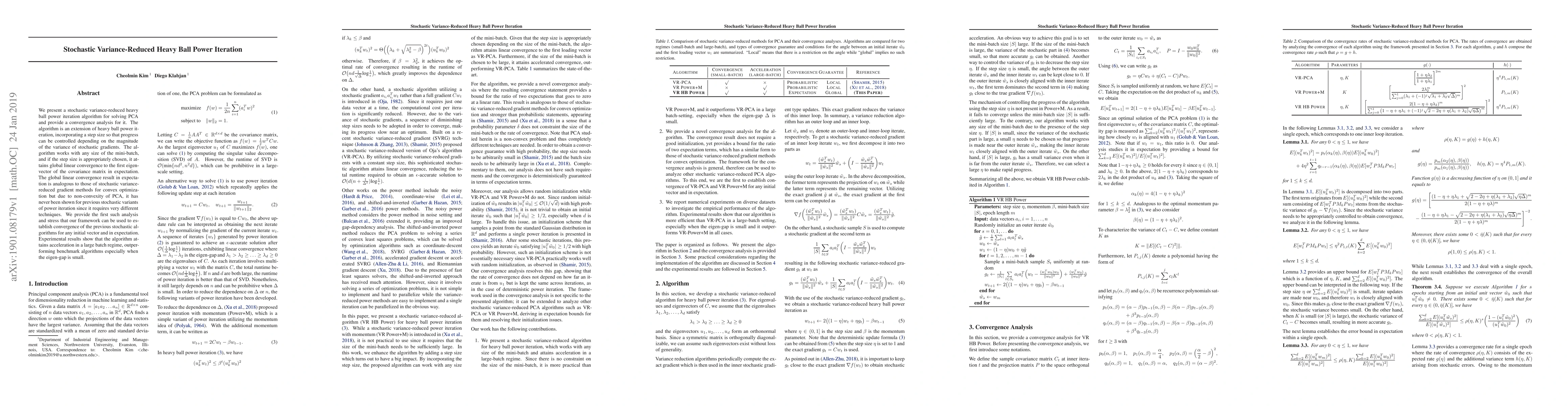 This paper introduces a stochastic variance-reduced heavy ball power iteration algorithm for solving PCA, achieving global linear convergence in expectation. The algorithm controls step size based on variance of stochastic gradients, providing acceleration in large batch regimes.