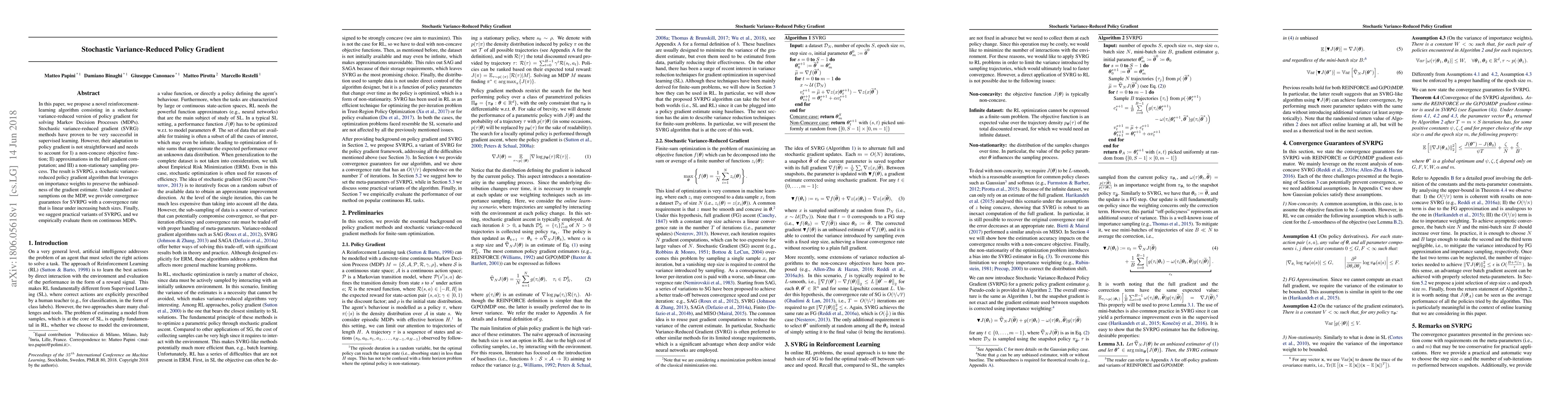 In this paper, we propose a novel reinforcement- learning algorithm consisting in a stochastic variance-reduced version of policy gradient for solving Markov Decision Processes (MDPs). Stochastic variance-reduced gradient (SVRG) methods have proven to be very successful in supervised learning. However, their adaptation to policy gradient is not straightforward and needs to account for I) a non-concave objective func- tion; II) approximations in the full gradient com- putation; and III) a non-stationary sampling pro- cess. The result is SVRPG, a stochastic variance- reduced policy gradient algorithm that leverages on importance weights to preserve the unbiased- ness of the gradient estimate. Under standard as- sumptions on the MDP, we provide convergence guarantees for SVRPG with a convergence rate that is linear under increasing batch sizes. Finally, we suggest practical variants of SVRPG, and we empirically evaluate them on continuous MDPs.