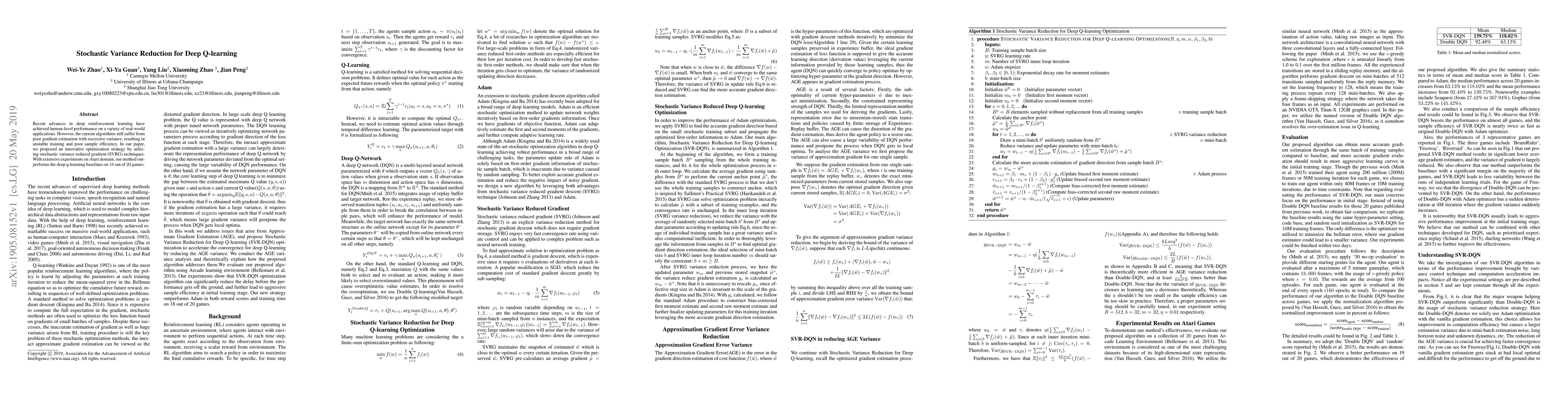 Recent advances in deep reinforcement learning have achieved human-level performance on a variety of real-world applications. However, the current algorithms still suffer from poor gradient estimation with excessive variance, resulting in unstable training and poor sample efficiency. In our paper, we proposed an innovative optimization strategy by utilizing stochastic variance reduced gradient (SVRG) techniques. With extensive experiments on Atari domain, our method outperforms the deep q-learning baselines on 18 out of 20 games.