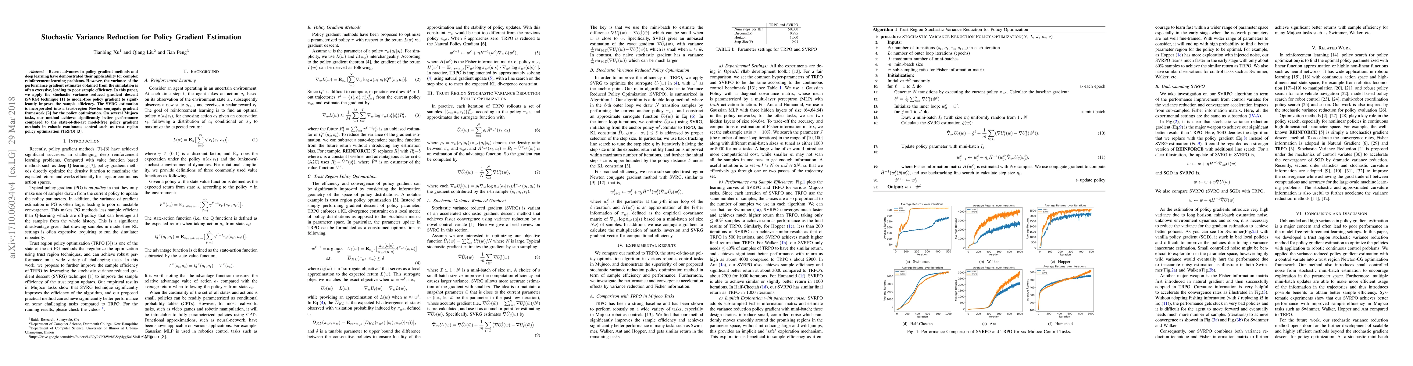 This paper introduces stochastic variance reduction to enhance model-free policy gradient methods, applying SVRG within a trust-region Newton conjugate gradient framework to improve sample efficiency. The proposed method outperforms state-of-the-art techniques on Mujoco robotic control tasks.