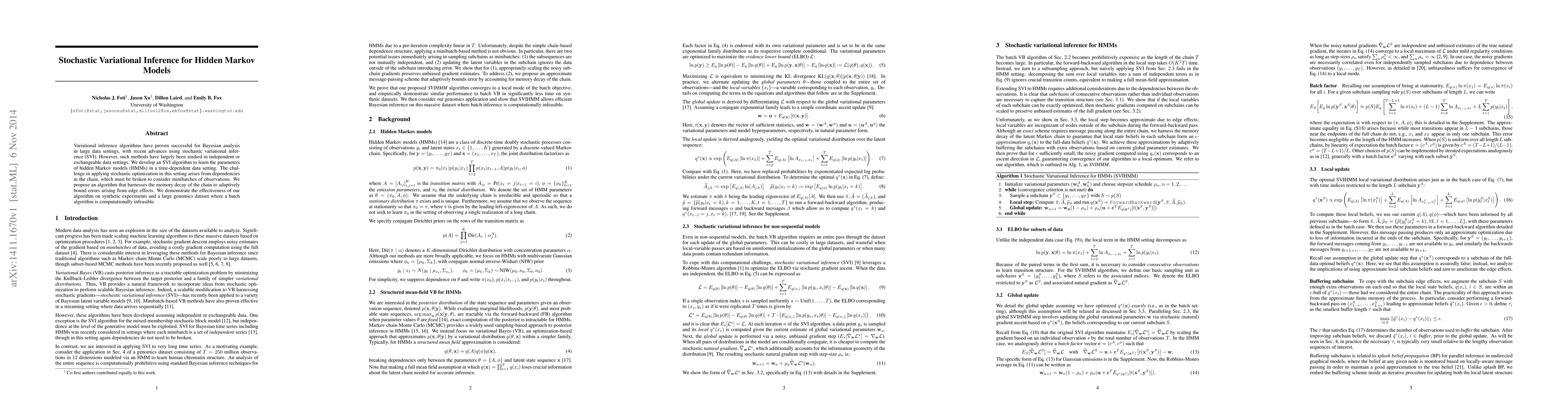 Variational inference algorithms have proven successful for Bayesian analysis in large data settings, with recent advances using stochastic variational inference (SVI). However, such methods have largely been studied in independent or exchangeable data settings. We develop an SVI algorithm to learn the parameters of hidden Markov models (HMMs) in a time-dependent data setting. The challenge in applying stochastic optimization in this setting arises from dependencies in the chain, which must be broken to consider minibatches of observations. We propose an algorithm that harnesses the memory decay of the chain to adaptively bound errors arising from edge effects. We demonstrate the effectiveness of our algorithm on synthetic experiments and a large genomics dataset where a batch algorithm is computationally infeasible.