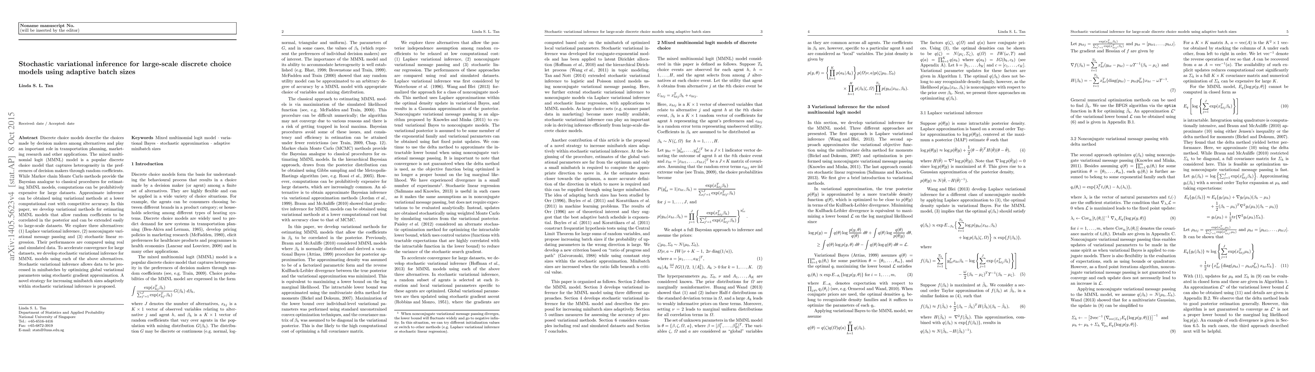 This paper develops variational methods for estimating mixed multinomial logit models, focusing on stochastic variational inference with adaptive minibatch sizes to handle large datasets efficiently. The study compares Laplace variational inference, nonconjugate variational message passing, and stochastic linear regression, demonstrating adaptive minibatch strategies to accelerate convergence.