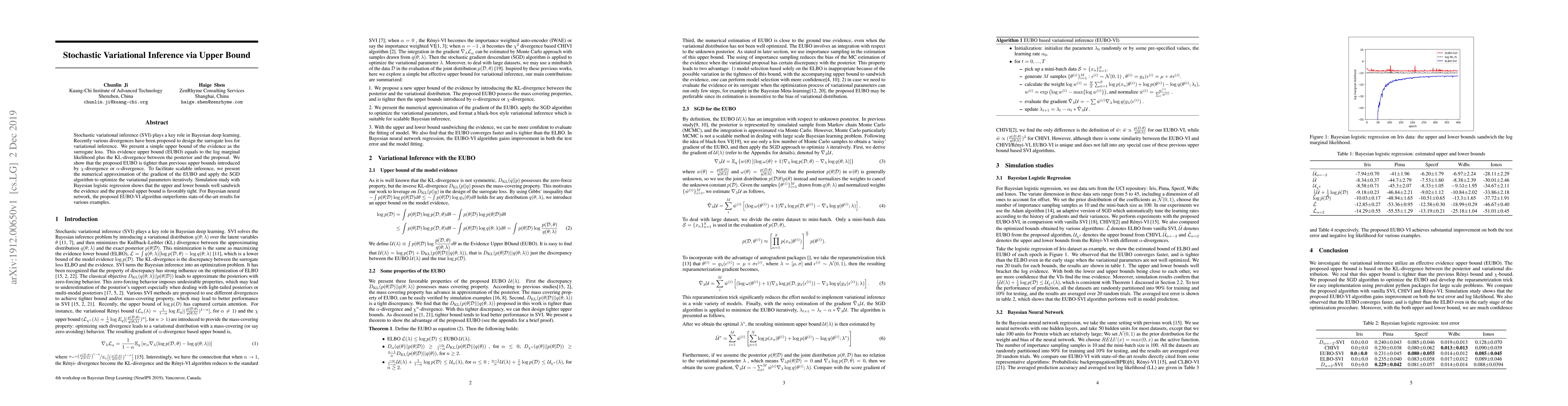 Stochastic variational inference (SVI) plays a key role in Bayesian deep learning. Recently various divergences have been proposed to design the surrogate loss for variational inference. We present a simple upper bound of the evidence as the surrogate loss. This evidence upper bound (EUBO) equals to the log marginal likelihood plus the KL-divergence between the posterior and the proposal. We show that the proposed EUBO is tighter than previous upper bounds introduced by $\chi$-divergence or $\alpha$-divergence. To facilitate scalable inference, we present the numerical approximation of the gradient of the EUBO and apply the SGD algorithm to optimize the variational parameters iteratively. Simulation study with Bayesian logistic regression shows that the upper and lower bounds well sandwich the evidence and the proposed upper bound is favorably tight. For Bayesian neural network, the proposed EUBO-VI algorithm outperforms state-of-the-art results for various examples.