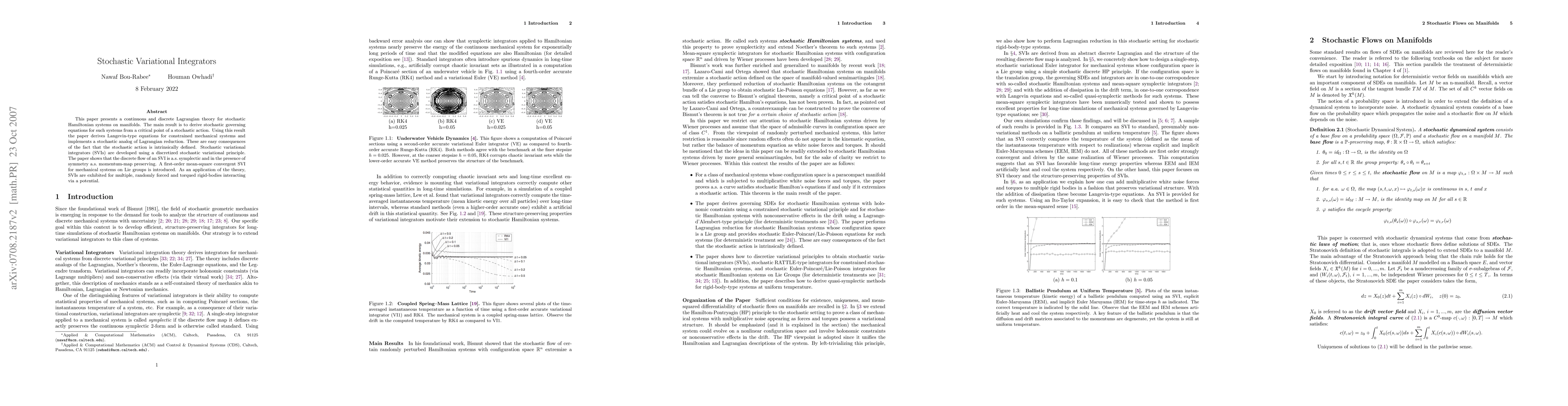 This paper develops stochastic variational integrators (SVIs) for Hamiltonian systems on manifolds, proving their symplecticity and momentum-map preservation. It applies SVIs to Langevin-type equations for constrained mechanical systems and multiple interacting rigid bodies.