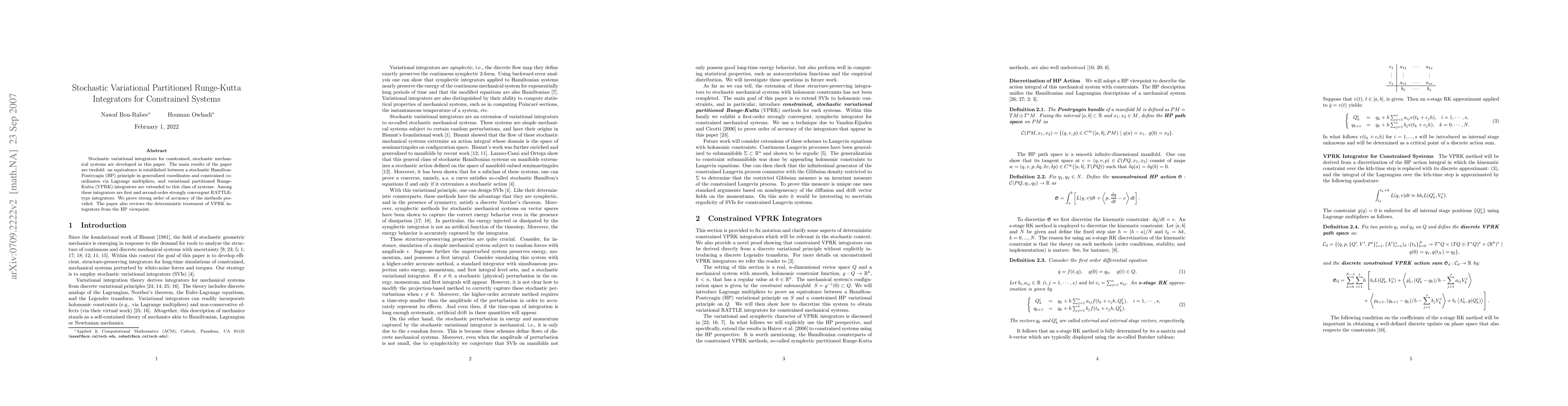 This paper develops stochastic variational integrators for constrained stochastic mechanical systems, establishing an equivalence between a stochastic Hamilton-Pontryagin principle in generalized and constrained coordinates. It extends variational partitioned Runge-Kutta (VPRK) integrators to these systems, including first and second-order strongly convergent RATTLE-type integrators, and proves their order of accuracy.