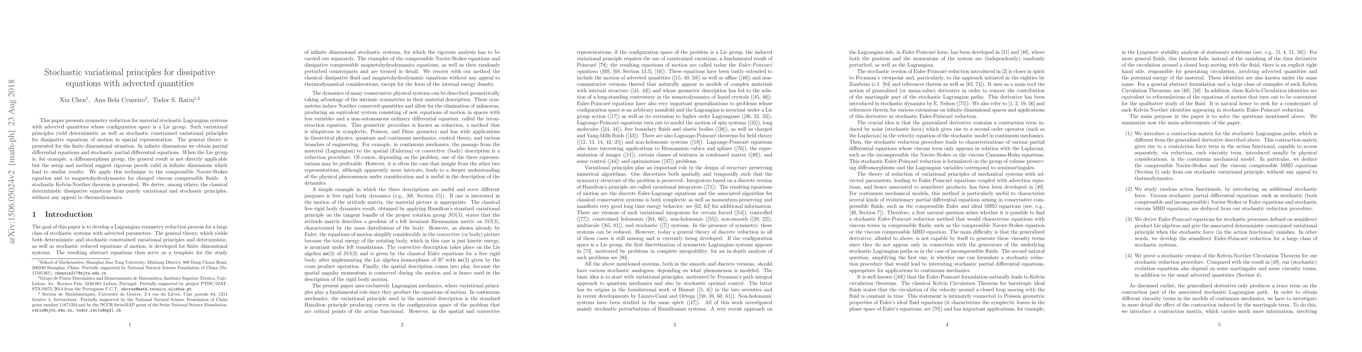 This paper develops symmetry reduction for stochastic Lagrangian systems with advected quantities on Lie groups, yielding deterministic and stochastic variational principles for dissipative equations. Applications include the compressible Navier-Stokes equation and magnetohydrodynamics, with a stochastic Kelvin-Noether theorem and derivation of classical dissipative equations from variational principles.
