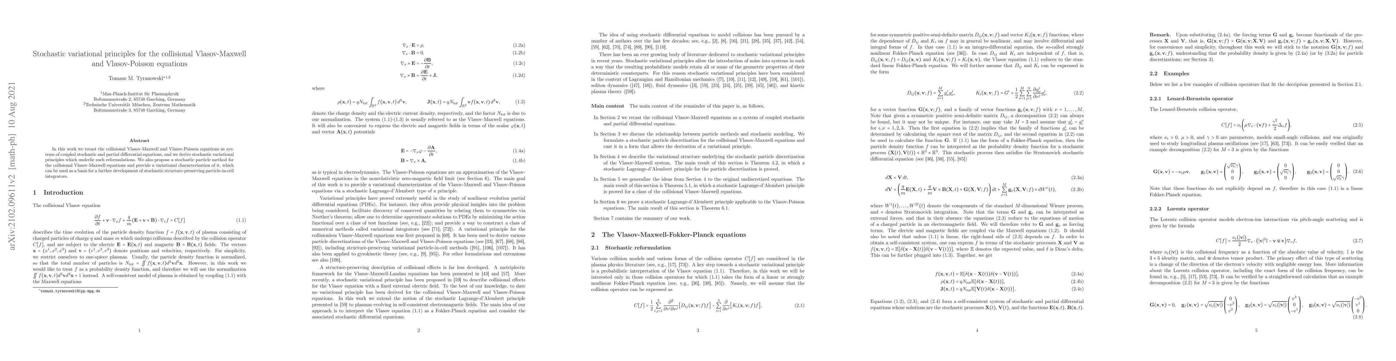 This paper reformulates the collisional Vlasov-Maxwell and Vlasov-Poisson equations as coupled stochastic and partial differential equations, deriving stochastic variational principles for these systems and proposing a particle method with a variational characterization for the Vlasov-Maxwell equations.
