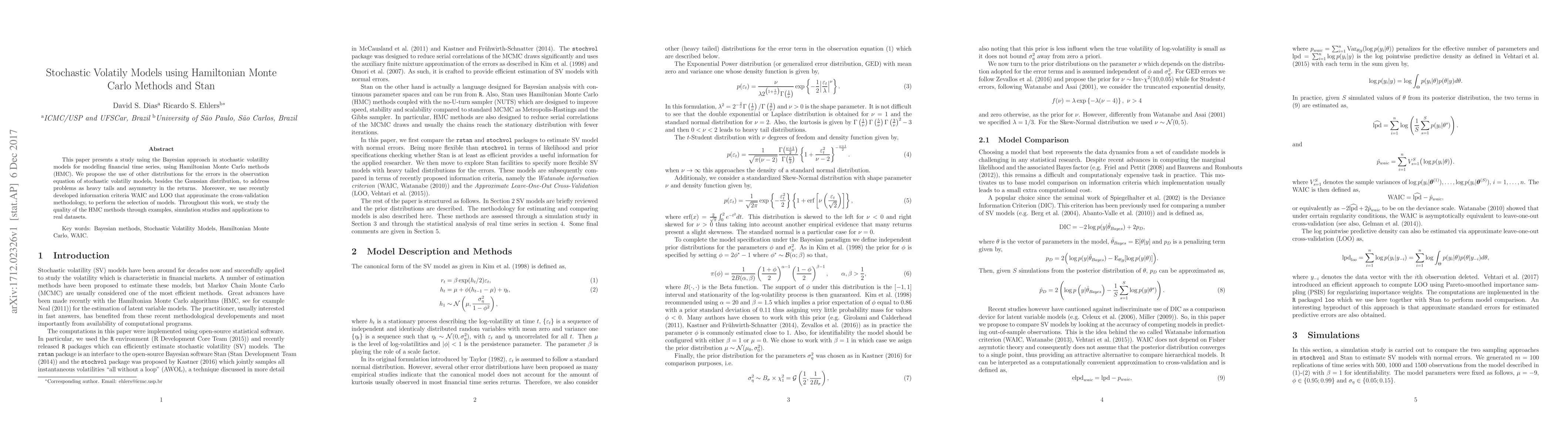 This paper presents a study using the Bayesian approach in stochastic volatility models for modeling financial time series, using Hamiltonian Monte Carlo methods (HMC). We propose the use of other distributions for the errors in the observation equation of stochastic volatility models, besides the Gaussian distribution, to address problems as heavy tails and asymmetry in the returns. Moreover, we use recently developed information criteria WAIC and LOO that approximate the cross-validation methodology, to perform the selection of models. Throughout this work, we study the quality of the HMC methods through examples, simulation studies and applications to real data sets.