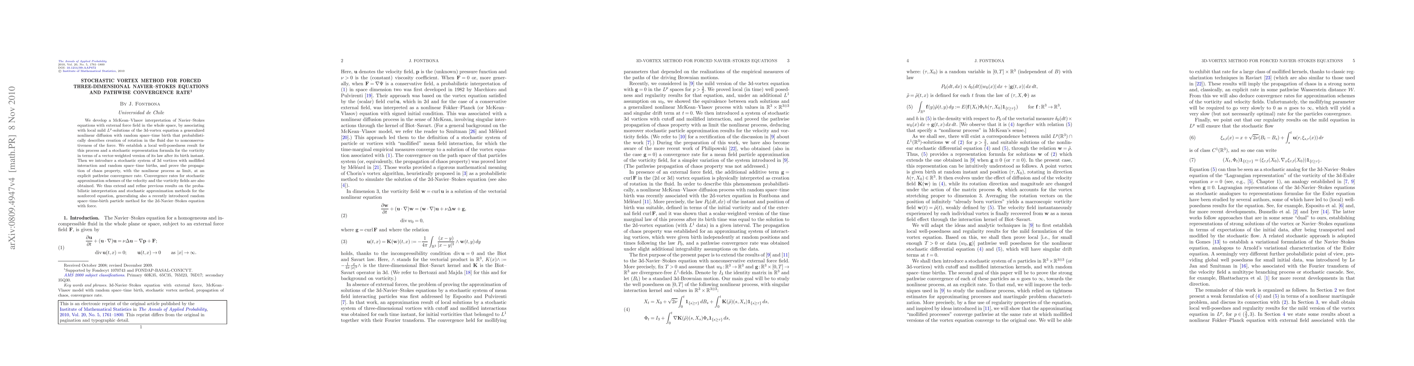 This paper develops a stochastic vortex method for the forced three-dimensional Navier-Stokes equations, establishing a local well-posedness and proving pathwise convergence rates. It introduces a stochastic system of vortices with random births and proves the propagation of chaos property.