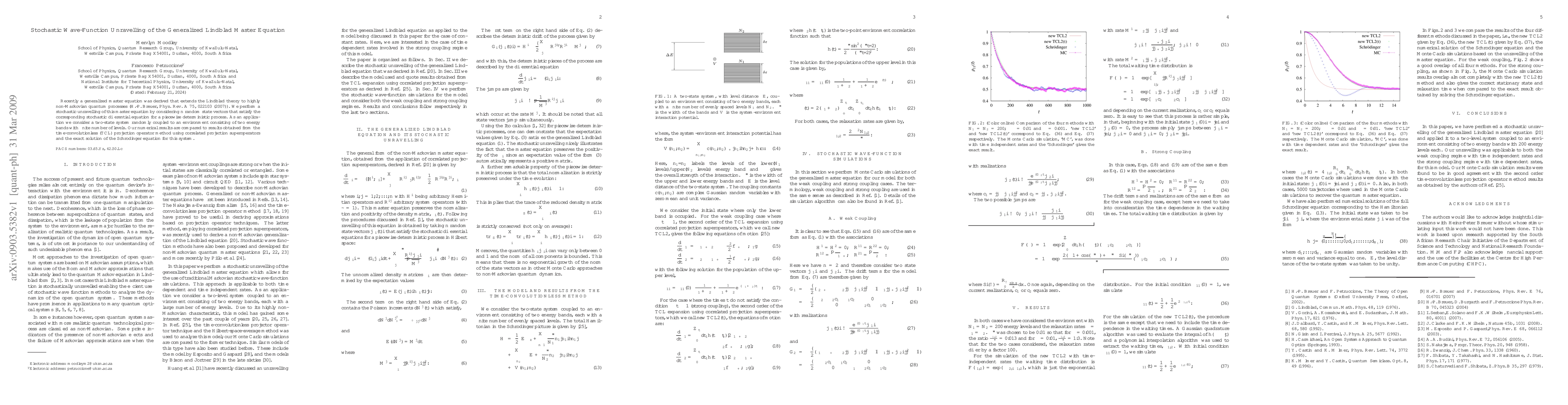 This paper unravels the generalized Lindblad master equation for non-Markovian quantum processes using stochastic differential equations and $n$ random state vectors. The study applies this to a two-state system coupled to a two-band environment, comparing results with the TCL projection operator method and the exact Schrödinger solution.