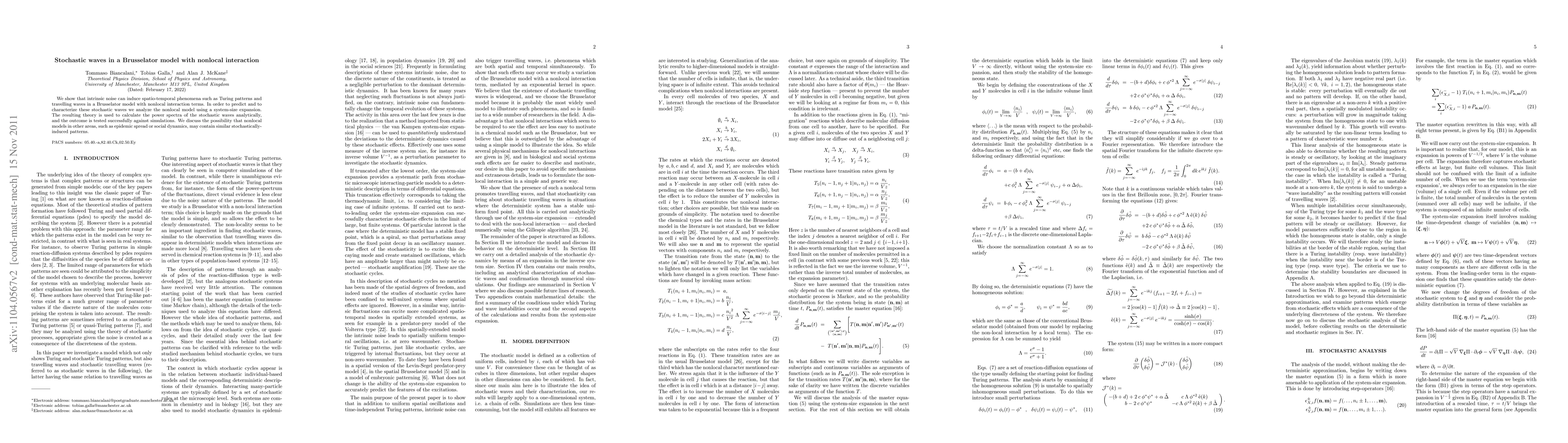 This paper demonstrates that intrinsic noise can generate Turing patterns and travelling waves in a Brusselator model with nonlocal interactions, using a system-size expansion to predict these quasi-waves. The study analytically calculates their power spectra and validates the theory with simulations.