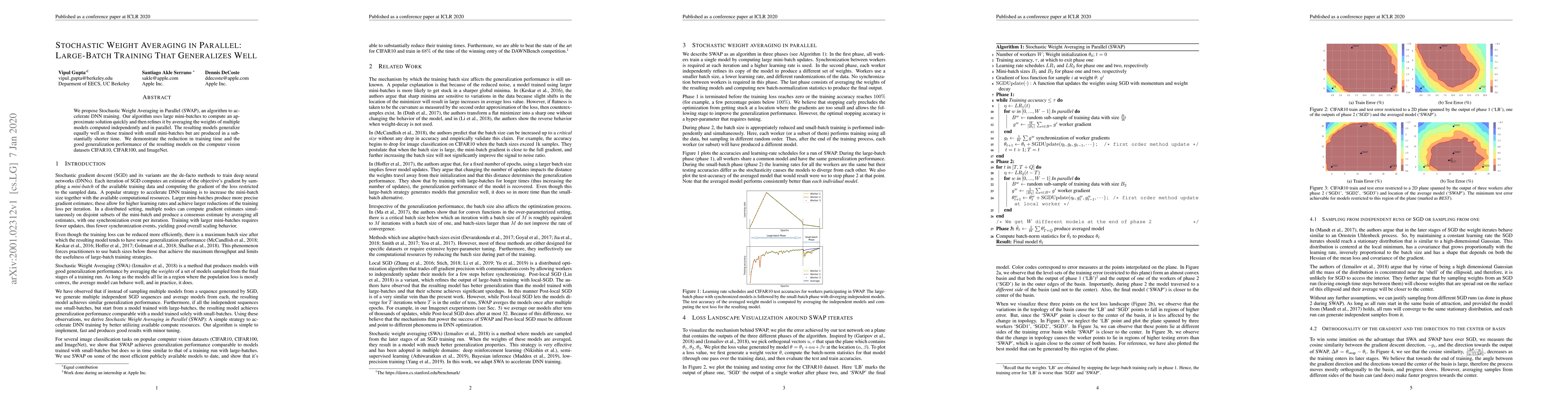 The paper introduces Stochastic Weight Averaging in Parallel (SWAP), an algorithm that accelerates deep neural network training using large mini-batches and parallel model averaging, achieving comparable generalization to small mini-batch training while significantly reducing training time. The effectiveness is demonstrated on CIFAR10, CIFAR100, and ImageNet datasets.