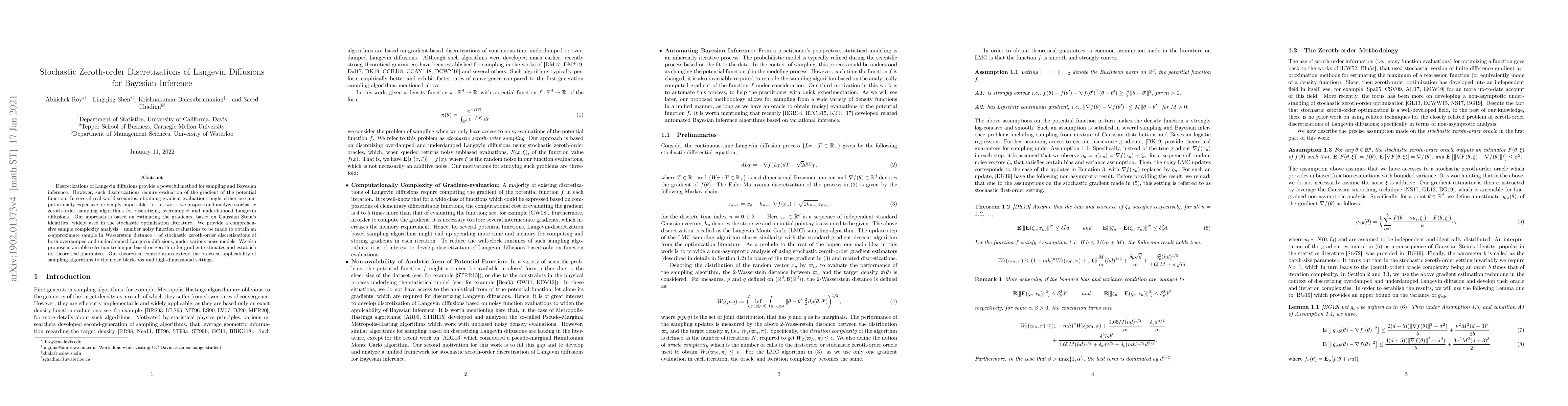 This paper proposes stochastic zeroth-order discretizations for overdamped and underdamped Langevin diffusions to enable Bayesian inference without gradient evaluations. It analyzes sample complexity and introduces a variable selection technique based on zeroth-order gradient estimates, extending practical applicability to noisy black-box and high-dimensional settings.