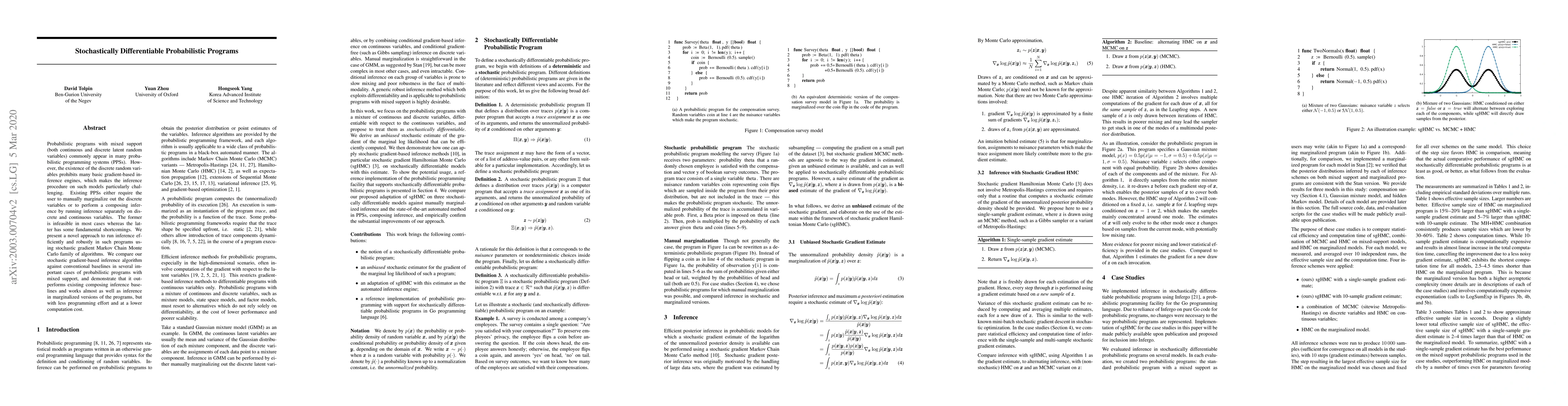 This paper introduces a novel stochastic gradient-based inference method for probabilistic programs with mixed continuous and discrete latent variables, using stochastic gradient Markov Chain Monte Carlo algorithms. The proposed method outperforms existing composing inference techniques and requires less programming effort and lower computational costs.
