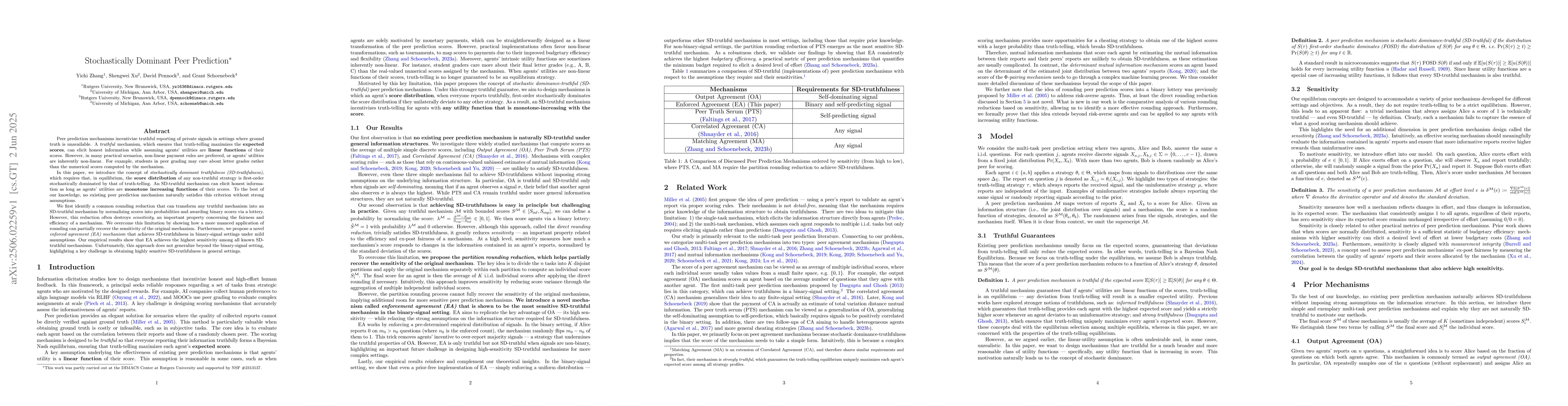 The introduction of stochastically dominant truthfulness (SD-truthfulness) as a stronger guarantee for peer prediction mechanisms and the development of an enforced agreement (EA) mechanism that is theoretically guaranteed to be SD-truthful in binary-signal settings.
