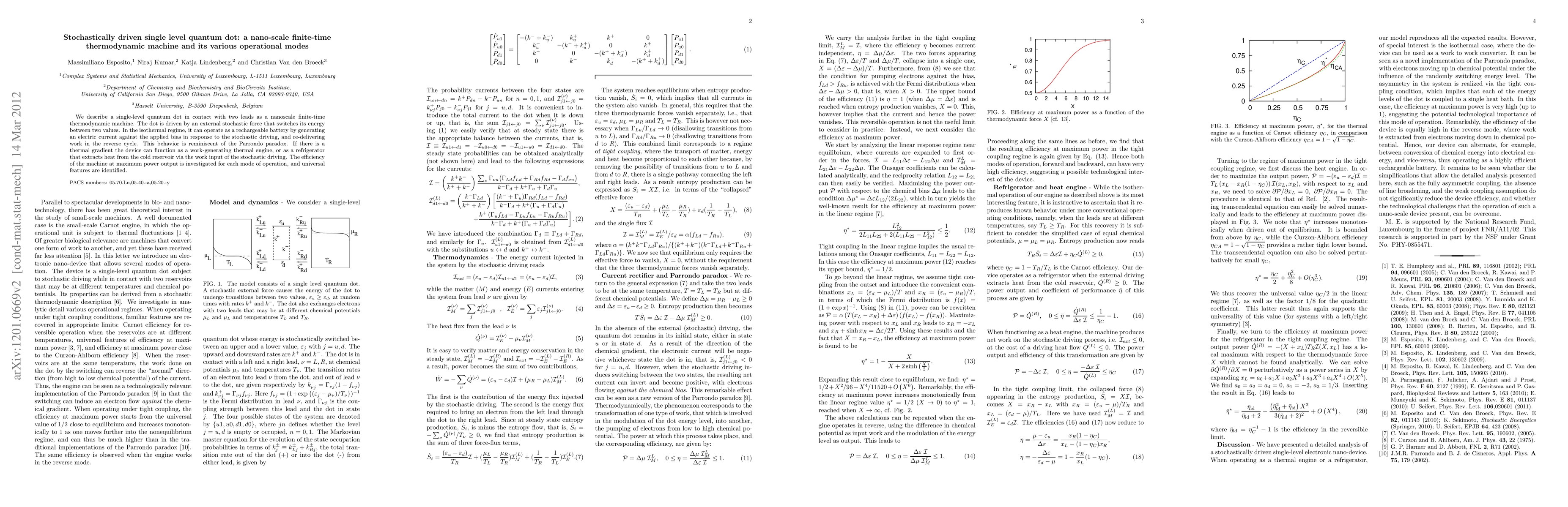 We describe a single-level quantum dot in contact with two leads as a nanoscale finite-time thermodynamic machine. The dot is driven by an external stochastic force that switches its energy between two values. In the isothermal regime, it can operate as a rechargeable battery by generating an electric current against the applied bias in response to the stochastic driving, and re-delivering work in the reverse cycle. This behavior is reminiscent of the Parrondo paradox. If there is a thermal gradient the device can function as a work-generating thermal engine, or as a refrigerator that extracts heat from the cold reservoir via the work input of the stochastic driving. The efficiency of the machine at maximum power output is investigated for each mode of operation, and universal features are identified.