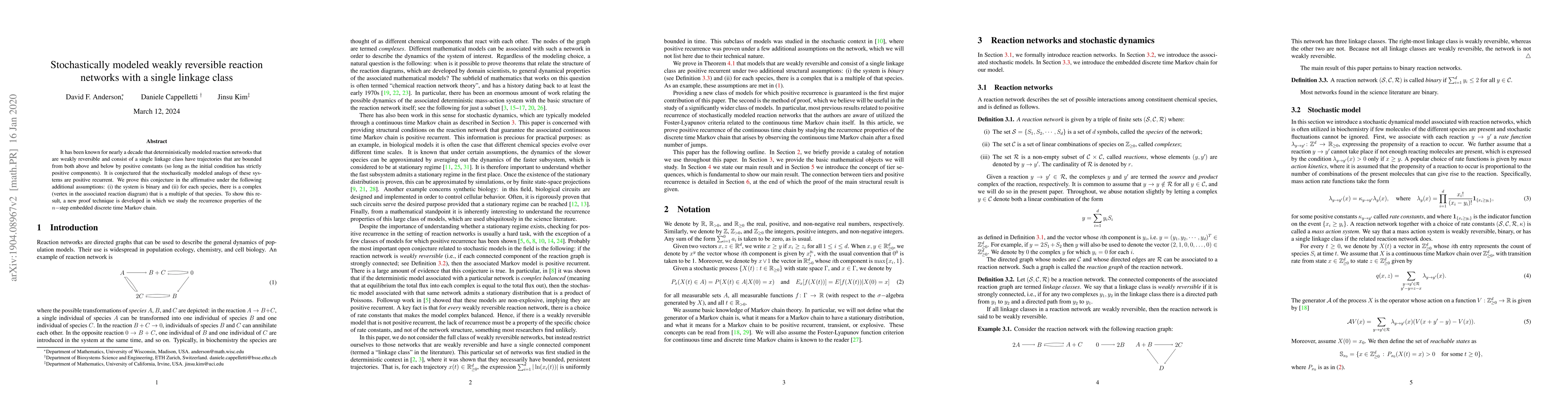 This paper proves the positive recurrence of stochastically modeled weakly reversible reaction networks with a single linkage class, under the assumptions that the system is binary and each species has a complex that is a multiple of it. A new proof technique involving the $n-$step embedded discrete time Markov chain is developed to establish this result.