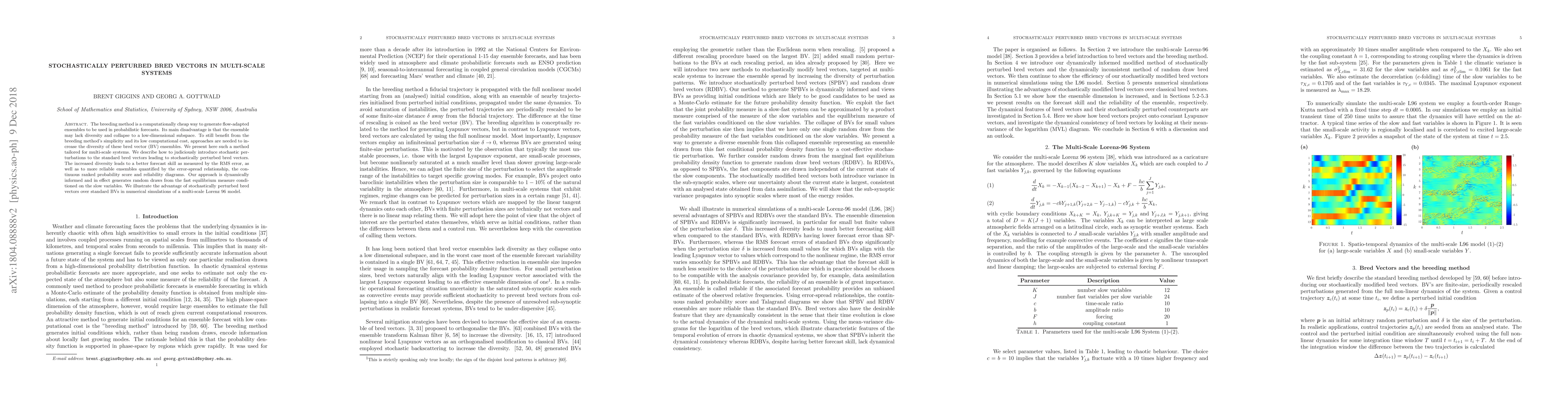 The breeding method is a computationally cheap way to generate flow-adapted ensembles to be used in probabilistic forecasts. Its main disadvantage is that the ensemble may lack diversity and collapse to a low-dimensional subspace. To still benefit from the breeding method's simplicity and its low computational cost, approaches are needed to increase the diversity of these bred vector (BV) ensembles. We present here such a method tailored for multi-scale systems. We describe how to judiciously introduce stochastic perturbations to the standard bred vectors leading to stochastically perturbed bred vectors. The increased diversity leads to a better forecast skill as measured by the RMS error, as well as to more reliable ensembles quantified by the error-spread relationship, the continuous ranked probability score and reliability diagrams. Our approach is dynamically informed and in effect generates random draws from the fast equilibrium measure conditioned on the slow variables. We illustrate the advantage of stochastically perturbed bred vectors over standard BVs in numerical simulations of a multi-scale Lorenz 96 model.