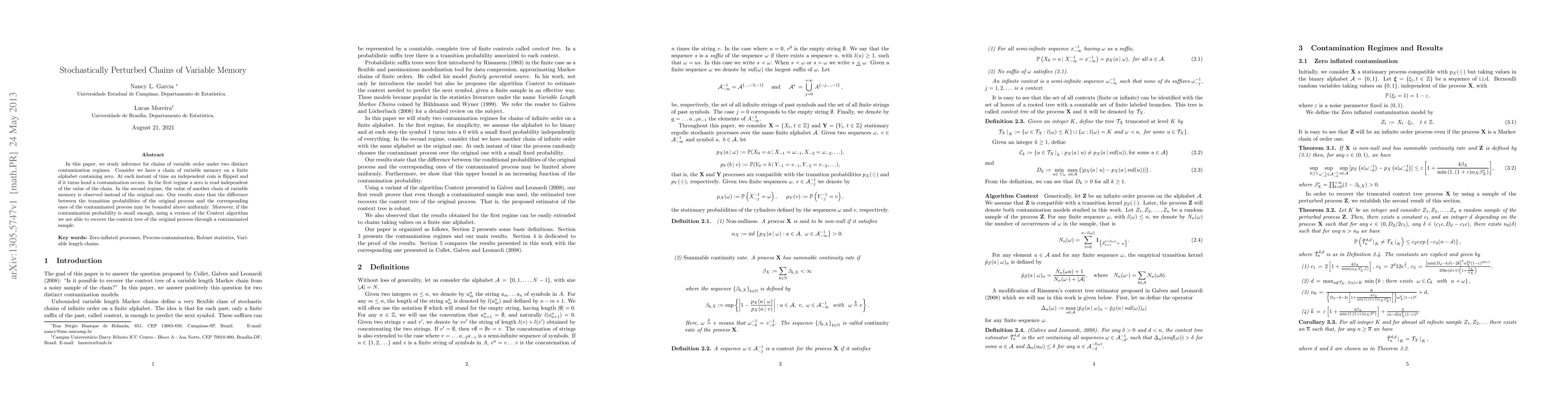 This paper investigates inference for stochastically perturbed chains of variable memory under two contamination regimes, showing that the difference in transition probabilities can be bounded, and context tree recovery is feasible with a small contamination probability using a Context algorithm.