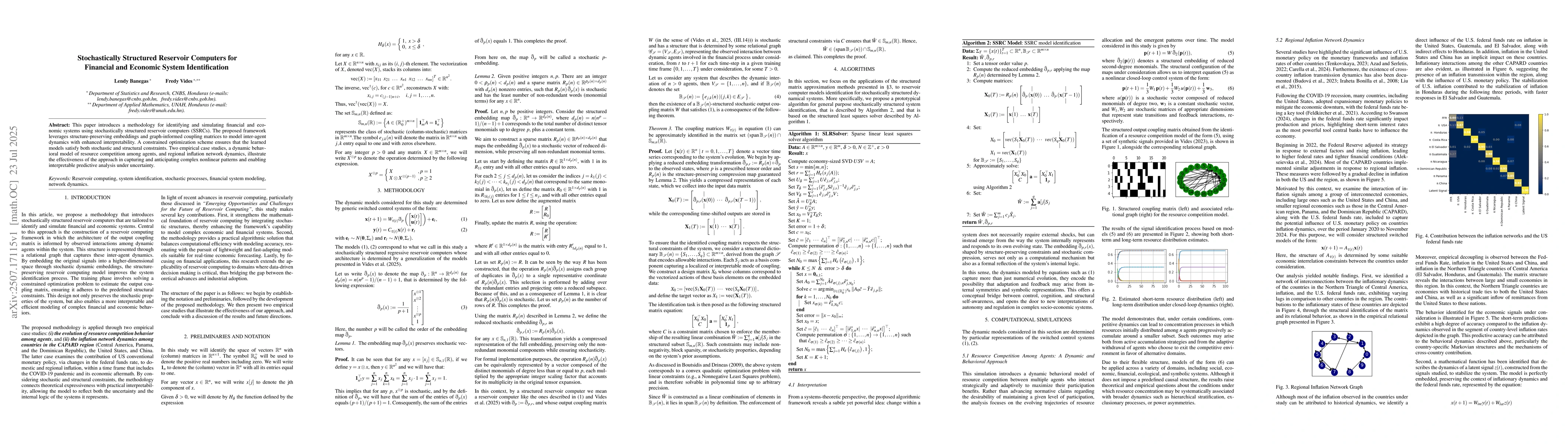 This paper introduces a methodology for identifying and simulating financial and economic systems using stochastically structured reservoir computers (SSRCs). The proposed framework leverages structure-preserving embeddings and graph-informed coupling matrices to model inter-agent dynamics with enhanced interpretability. A constrained optimization scheme ensures that the learned models satisfy both stochastic and structural constraints. Two empirical case studies, a dynamic behavioral model of resource competition among agents, and regional inflation network dynamics, illustrate the effectiveness of the approach in capturing and anticipating complex nonlinear patterns and enabling interpretable predictive analysis under uncertainty.