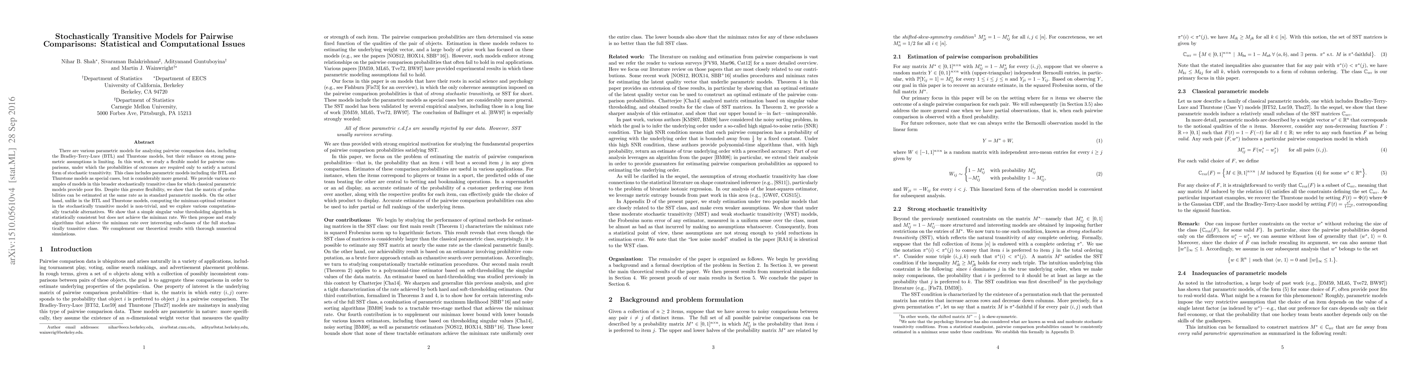 There are various parametric models for analyzing pairwise comparison data, including the Bradley-Terry-Luce (BTL) and Thurstone models, but their reliance on strong parametric assumptions is limiting. In this work, we study a flexible model for pairwise comparisons, under which the probabilities of outcomes are required only to satisfy a natural form of stochastic transitivity. This class includes parametric models including the BTL and Thurstone models as special cases, but is considerably more general. We provide various examples of models in this broader stochastically transitive class for which classical parametric models provide poor fits. Despite this greater flexibility, we show that the matrix of probabilities can be estimated at the same rate as in standard parametric models. On the other hand, unlike in the BTL and Thurstone models, computing the minimax-optimal estimator in the stochastically transitive model is non-trivial, and we explore various computationally tractable alternatives. We show that a simple singular value thresholding algorithm is statistically consistent but does not achieve the minimax rate. We then propose and study algorithms that achieve the minimax rate over interesting sub-classes of the full stochastically transitive class. We complement our theoretical results with thorough numerical simulations.