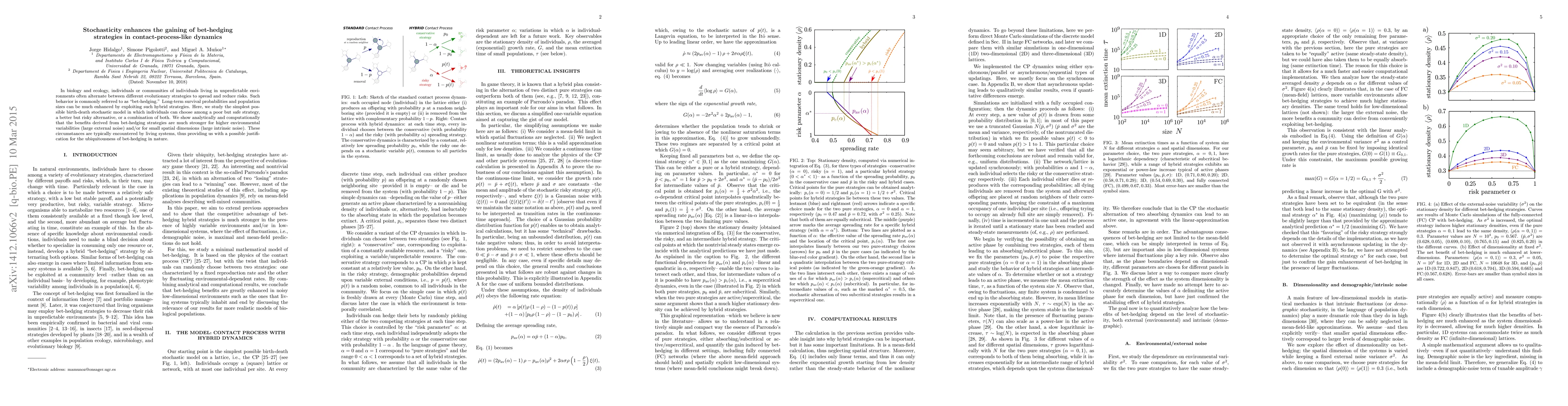 In biology and ecology, individuals or communities of individuals living in unpredictable environments often alternate between different evolutionary strategies to spread and reduce risks. Such behavior is commonly referred to as "bet-hedging." Long-term survival probabilities and population sizes can be much enhanced by exploiting such hybrid strategies. Here, we study the simplest possible birth-death stochastic model in which individuals can choose among a poor but safe strategy, a better but risky alternative, or a combination of both. We show analytically and computationally that the benefits derived from bet-hedging strategies are much stronger for higher environmental variabilities (large external noise) and/or for small spatial dimensions (large intrinsic noise). These circumstances are typically encountered by living systems, thus providing us with a possible justification for the ubiquitousness of bet-hedging in nature.