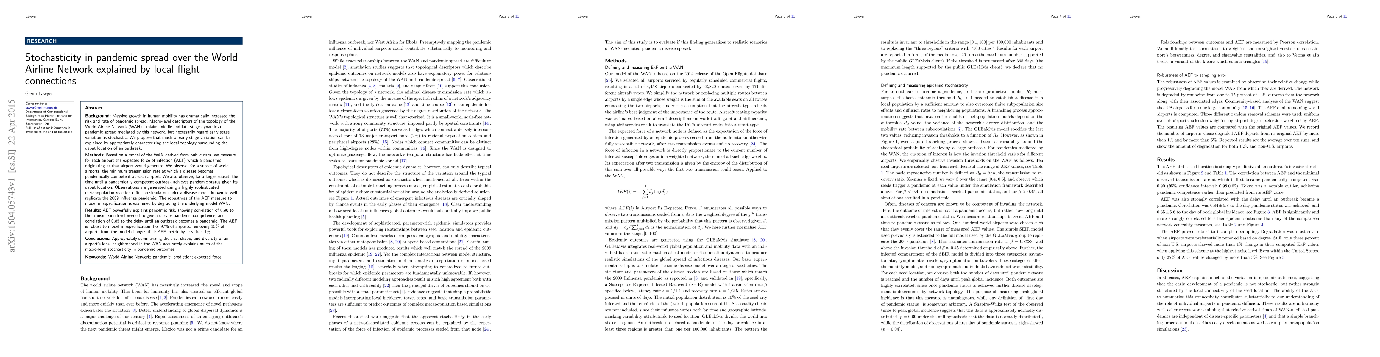 Massive growth in human mobility has dramatically increased the risk and rate of pandemic spread. Macro-level descriptors of the topology of the World Airline Network (WAN) explains middle and late stage dynamics of pandemic spread mediated by this network, but necessarily regard early stage variation as stochastic. We propose that much of early stage variation can be explained by appropriately characterizing the local topology surrounding the debut location of an outbreak. We measure for each airport the expected force of infection (AEF) which a pandemic originating at that airport would generate. We observe, for a subset of world airports, the minimum transmission rate at which a disease becomes pandemically competent at each airport. We also observe, for a larger subset, the time until a pandemically competent outbreak achieves pandemic status given its debut location. Observations are generated using a highly sophisticated metapopulation reaction-diffusion simulator under a disease model known to well replicate the 2009 influenza pandemic. The robustness of the AEF measure to model misspecification is examined by degrading the network model. AEF powerfully explains pandemic risk, showing correlation of 0.90 to the transmission level needed to give a disease pandemic competence, and correlation of 0.85 to the delay until an outbreak becomes a pandemic. The AEF is robust to model misspecification. For 97% of airports, removing 15% of airports from the model changes their AEF metric by less than 1%. Appropriately summarizing the size, shape, and diversity of an airport's local neighborhood in the WAN accurately explains much of the macro-level stochasticity in pandemic outcomes.