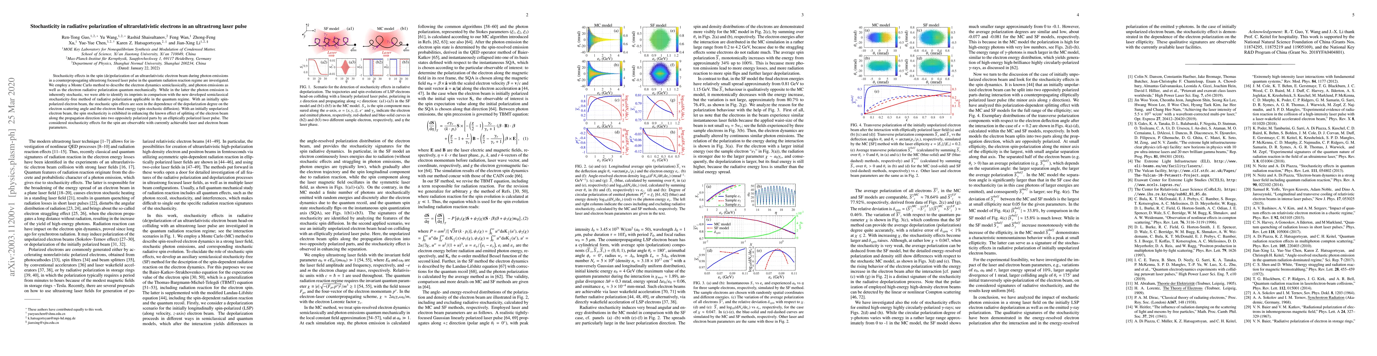 Stochasticity effects in the spin (de)polarization of an ultrarelativistic electron beam during photon emissions in a counterpropoagating ultrastrong focused laser pulse in the quantum radiation reaction regime are investigated. We employ a Monte Carlo method to describe the electron dynamics semiclassically, and photon emissions as well as the electron radiative polarization quantum mechanically. While in the latter the photon emission is inherently stochastic, we were able to identify its imprints in comparison with the new developed semiclassical stochasticity-free method of radiative polarization applicable in the quantum regime. With an initially spin-polarized electron beam, the stochastic spin effects are seen in the dependence of the depolarization degree on the electron scattering angle and the electron final energy (spin stochastic diffusion). With an initially unpolarized electron beam, the spin stochasticity is exhibited in enhancing the known effect of splitting of the electron beam along the propagation direction into two oppositely polarized parts by an elliptically polarized laser pulse. The considered stochasticity effects for the spin are observable with currently achievable laser and electron beam parameters.