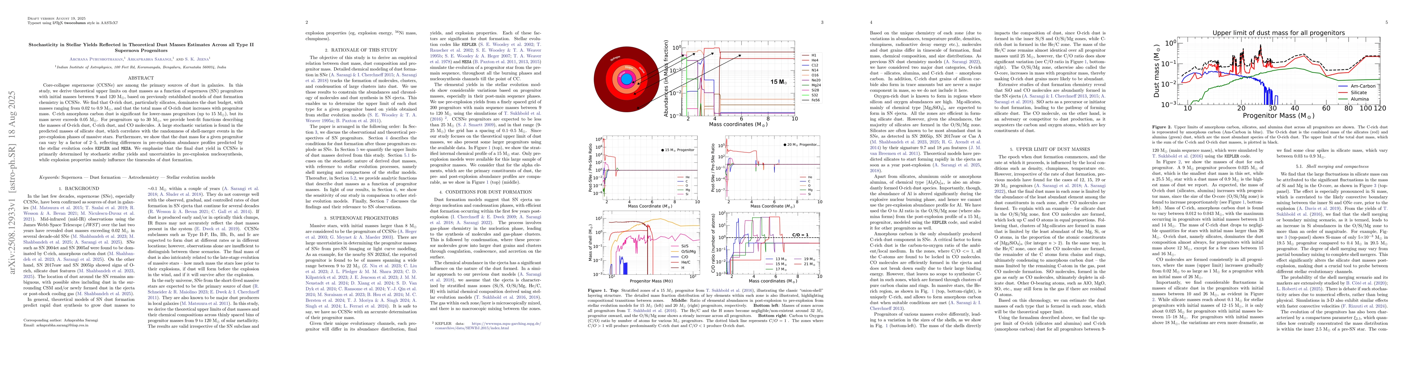 Core-collapse supernovae (CCSNe) are among the primary sources of dust in galaxies. In this study, we derive theoretical upper limits on dust masses as a function of supernova (SN) progenitors with initial masses between 9 and 120 Msun, based on previously established models of dust formation chemistry in CCSNe. We find that O-rich dust, particularly silicates, dominates the dust budget, with masses ranging from 0.02 to 0.9 Msun, and that the total mass of O-rich dust increases with progenitor mass. C-rich amorphous carbon dust is significant for lower-mass progenitors (up to 15 Msun), but its mass never exceeds 0.05 Msun. For progenitors up to 30 Msun, we provide best-fit functions describing the masses of O-rich dust, C-rich dust, and CO molecules. A large stochastic variation is found in the predicted masses of silicate dust, which correlates with the randomness of shell-merger events in the pre-explosion phases of massive stars. Furthermore, we show that the dust mass for a given progenitor can vary by a factor of 2-5, reflecting differences in pre-explosion abundance profiles predicted by the stellar evolution codes KEPLER and MESA. We emphasize that the final dust yield in CCSNe is primarily determined by stochastic stellar yields and uncertainties in pre-explosion nucleosynthesis, while explosion properties mainly influence the timescales of dust formation.