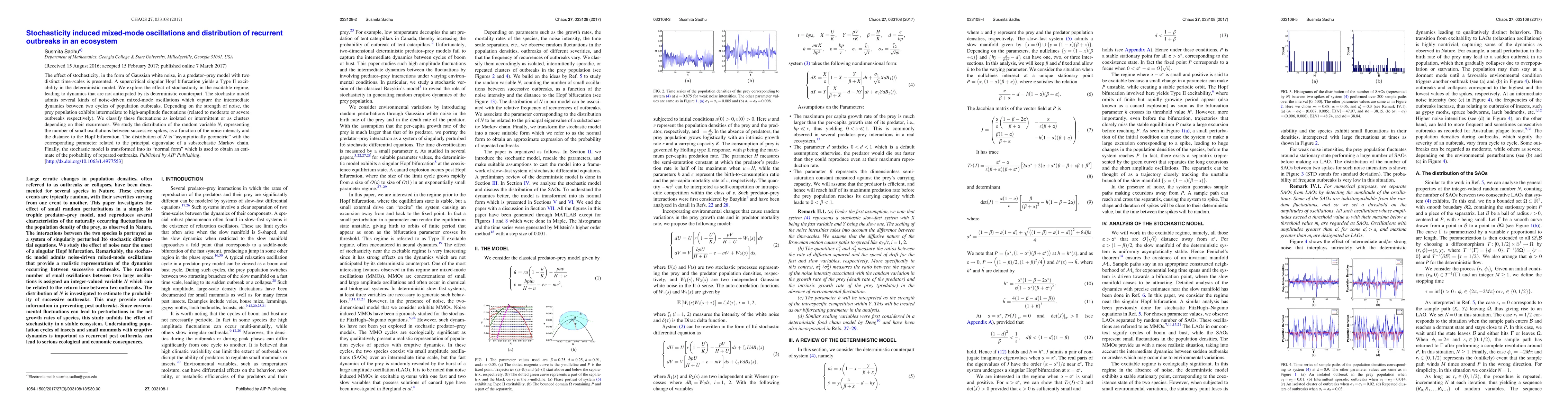 This paper investigates how stochasticity in a predator-prey model with two time-scales leads to mixed-mode oscillations and varying outbreak patterns. The study reveals the emergence of intermediate dynamics and classifies fluctuations into isolated, intermittent, or clustered outbreaks, with the distribution of small oscillations between spikes depending on noise intensity and bifurcation proximity.