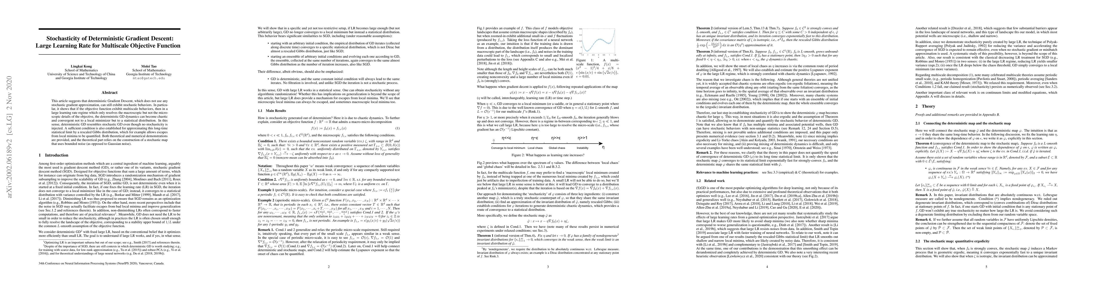 This article suggests that deterministic Gradient Descent, which does not use any stochastic gradient approximation, can still exhibit stochastic behaviors. In particular, it shows that if the objective function exhibit multiscale behaviors, then in a large learning rate regime which only resolves the macroscopic but not the microscopic details of the objective, the deterministic GD dynamics can become chaotic and convergent not to a local minimizer but to a statistical distribution. A sufficient condition is also established for approximating this long-time statistical limit by a rescaled Gibbs distribution. Both theoretical and numerical demonstrations are provided, and the theoretical part relies on the construction of a stochastic map that uses bounded noise (as opposed to discretized diffusions).