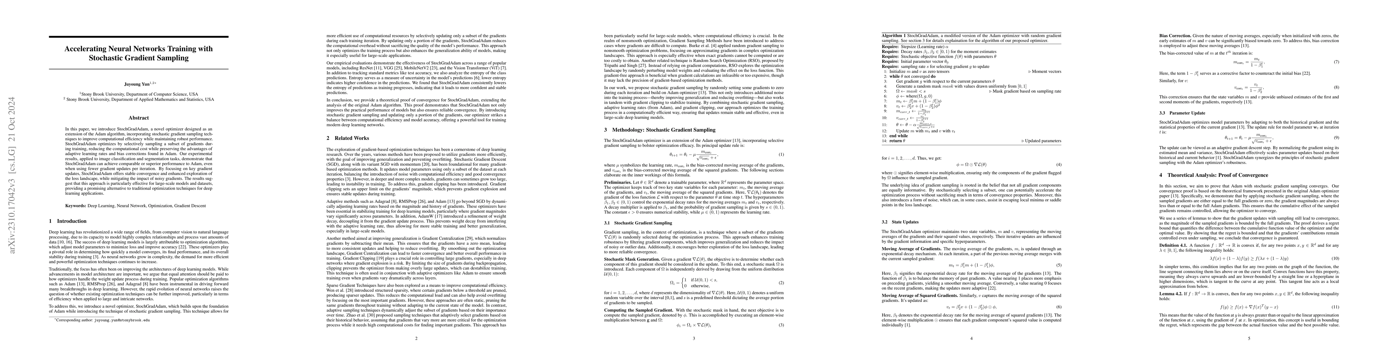 In the rapidly advancing domain of deep learning optimization, this paper unveils the StochGradAdam optimizer, a novel adaptation of the well-regarded Adam algorithm. Central to StochGradAdam is its gradient sampling technique. This method not only ensures stable convergence but also leverages the advantages of selective gradient consideration, fostering robust training by potentially mitigating the effects of noisy or outlier data and enhancing the exploration of the loss landscape for more dependable convergence. In both image classification and segmentation tasks, StochGradAdam has demonstrated superior performance compared to the traditional Adam optimizer. By judiciously sampling a subset of gradients at each iteration, the optimizer is optimized for managing intricate models. The paper provides a comprehensive exploration of StochGradAdam's methodology, from its mathematical foundations to bias correction strategies, heralding a promising advancement in deep learning training techniques.
