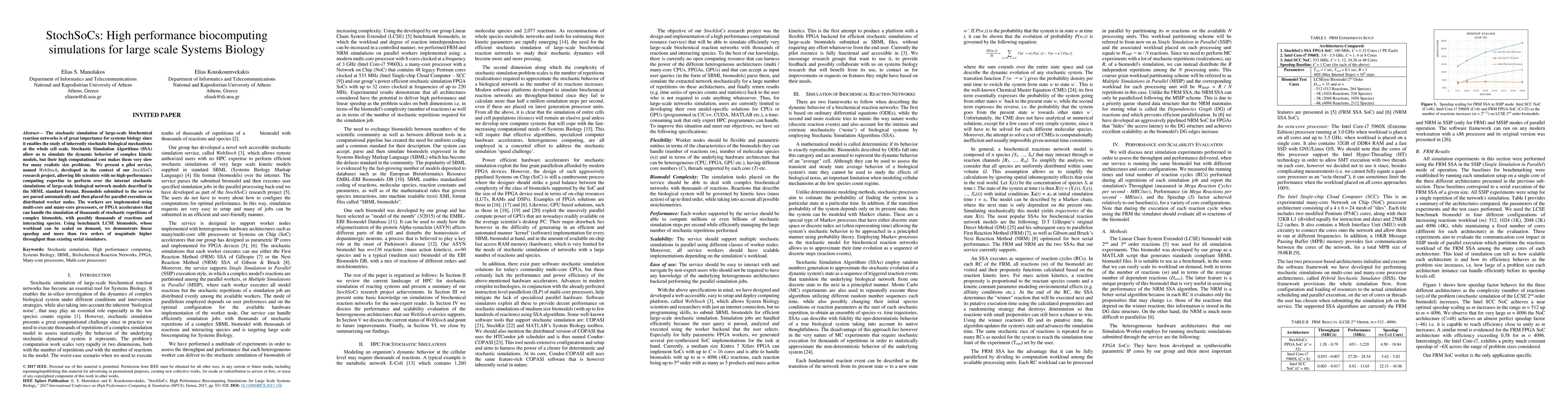 The stochastic simulation of large-scale biochemical reaction networks is of great importance for systems biology since it enables the study of inherently stochastic biological mechanisms at the whole cell scale. Stochastic Simulation Algorithms (SSA) allow us to simulate the dynamic behavior of complex kinetic models, but their high computational cost makes them very slow for many realistic size problems. We present a pilot service, named WebStoch, developed in the context of our StochSoCs research project, allowing life scientists with no high-performance computing expertise to perform over the internet stochastic simulations of large-scale biological network models described in the SBML standard format. Biomodels submitted to the service are parsed automatically and then placed for parallel execution on distributed worker nodes. The workers are implemented using multi-core and many-core processors, or FPGA accelerators that can handle the simulation of thousands of stochastic repetitions of complex biomodels, with possibly thousands of reactions and interacting species. Using benchmark LCSE biomodels, whose workload can be scaled on demand, we demonstrate linear speedup and more than two orders of magnitude higher throughput than existing serial simulators.