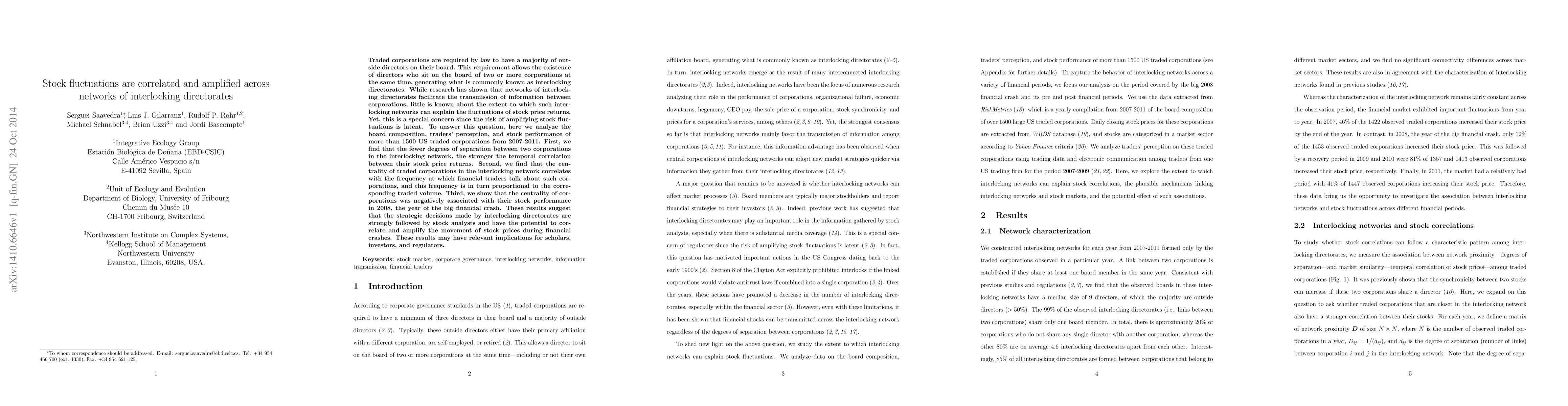 This research investigates how networks of interlocking directorates among corporations correlate and amplify stock price fluctuations. It finds that closer connections in these networks lead to stronger stock price return correlations and that central corporations in these networks experience more trader discussions and trading volume, which negatively impacted their stock performance during the 2008 financial crash.