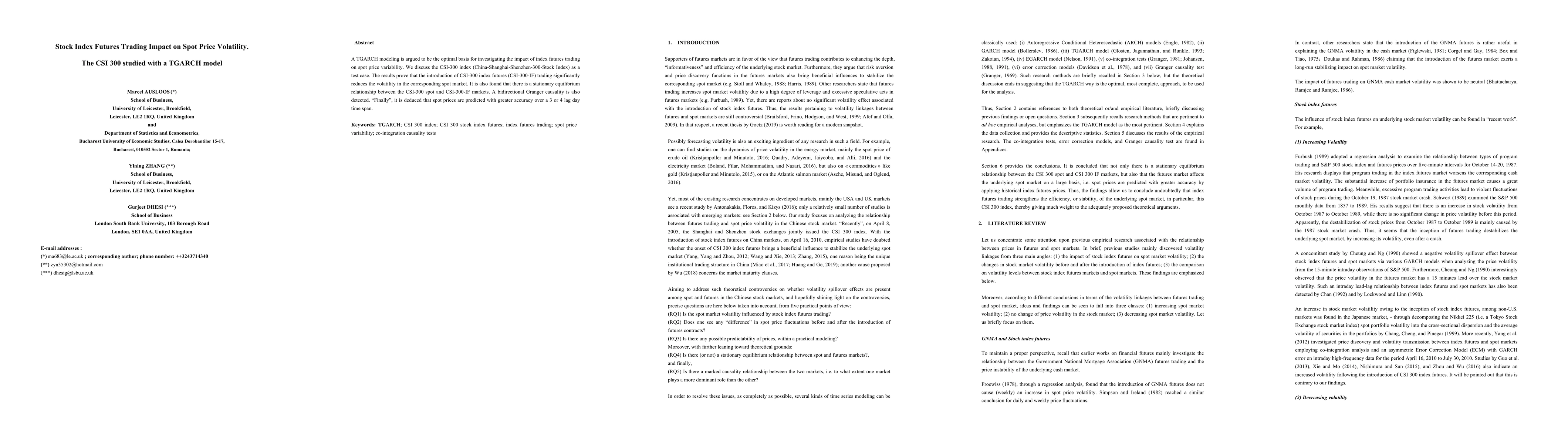 This study employs a TGARCH model to examine the impact of CSI 300 index futures trading on spot price volatility. The findings indicate that futures trading significantly reduces spot market volatility and establishes a stationary equilibrium between the futures and spot markets, with bidirectional Granger causality.