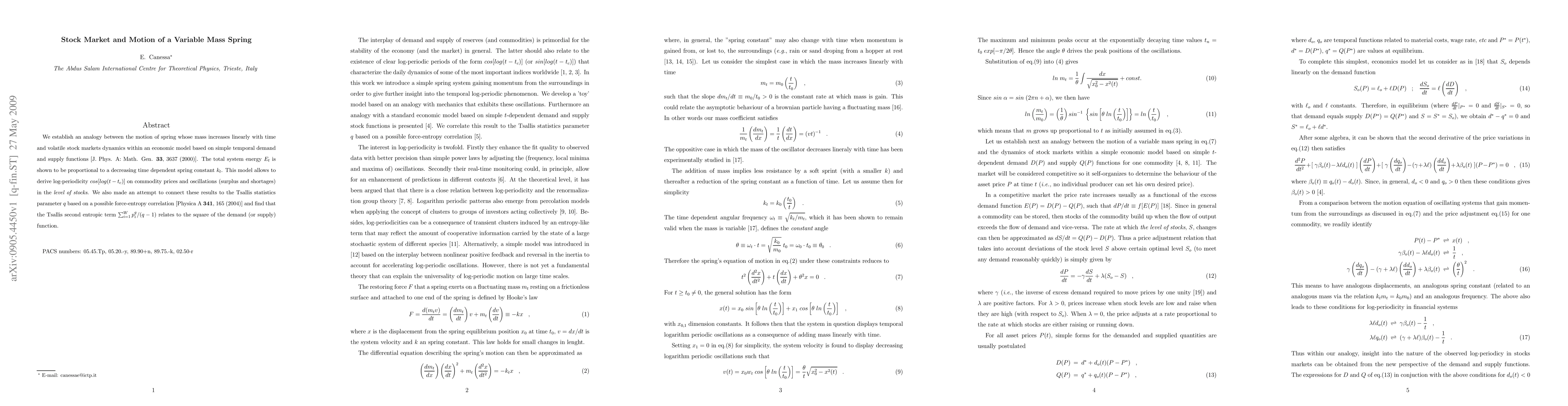 We establish an analogy between the motion of spring whose mass increases linearly with time and volatile stock markets dynamics within an economic model based on simple temporal demand and supply functions [J. Phys. A: Math. Gen. 33, 3637 (2000)]. The total system energy E_t is shown to be proportional to a decreasing time dependent spring constant k_t. This model allows to derive log-periodicity cos[log (t-t_{c})] on commodity prices and oscillations (surplus and shortages) in the level of stocks. We also made an attempt to connect these results to the Tsallis statistics parameter q based on a possible force-entropy correlation [Physica A 341, 165 (2004)] and find that the Tsallis second entropic term \sum_{i=1}^{W} p_i^{q}/(q-1) relates to the square of the demand (or supply) function.