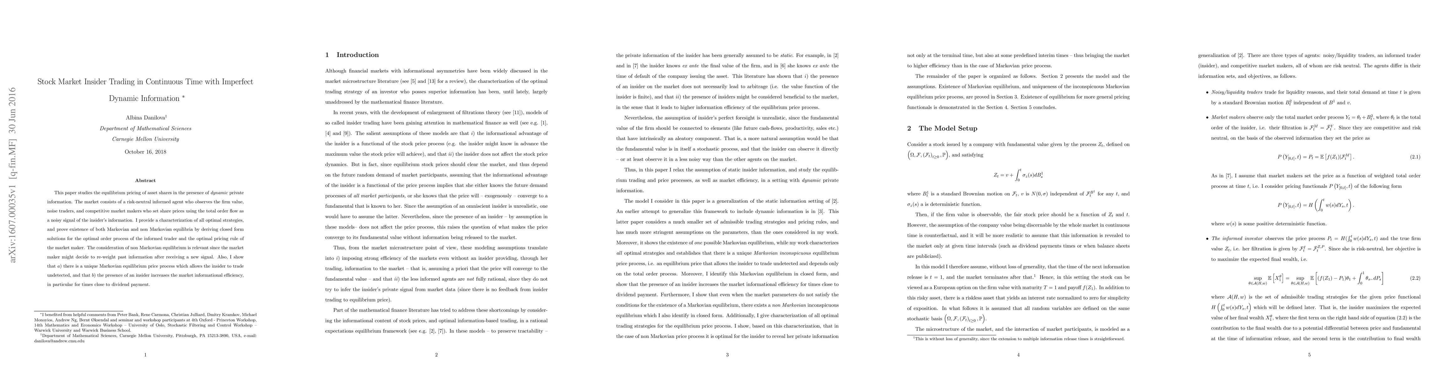 This paper explores the equilibrium pricing of shares in a market where an informed insider trades amidst dynamic private information, noise traders, and market makers. It characterizes optimal strategies and proves the existence of both Markovian and non-Markovian equilibria, showing that insider trading enhances market informational efficiency, especially near dividend payments.